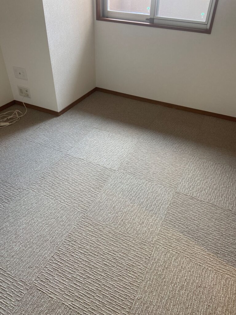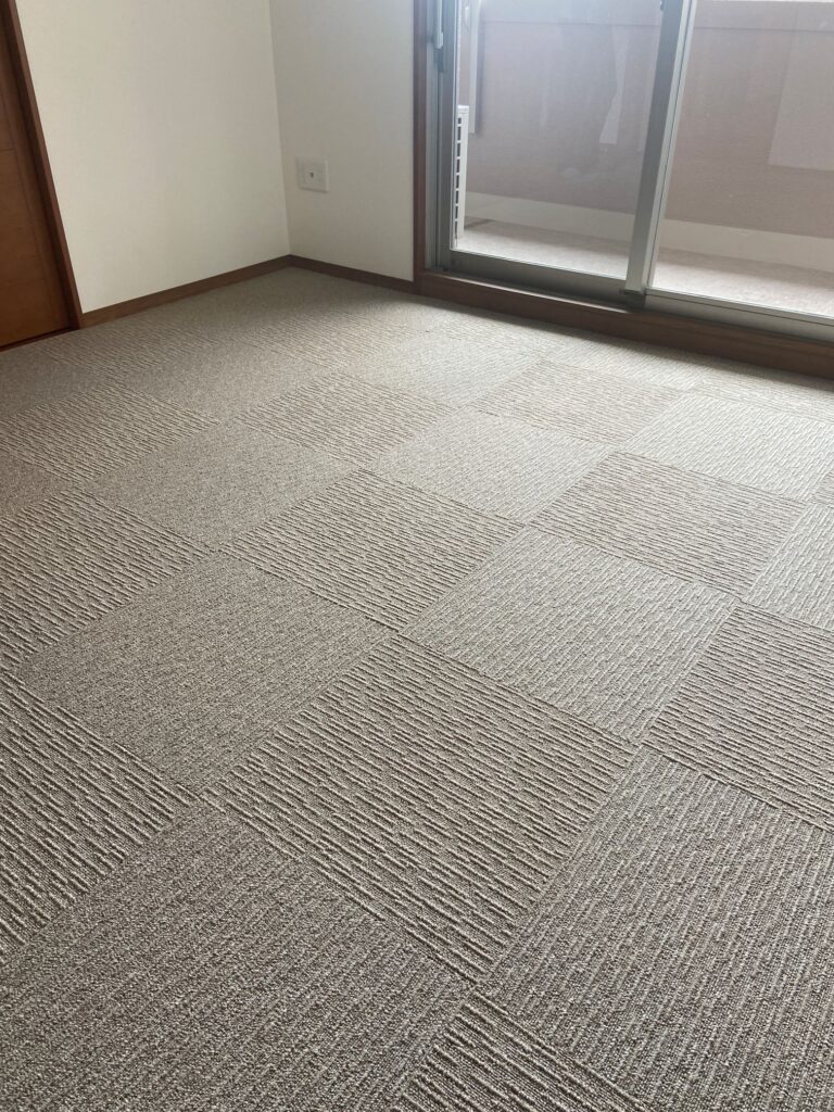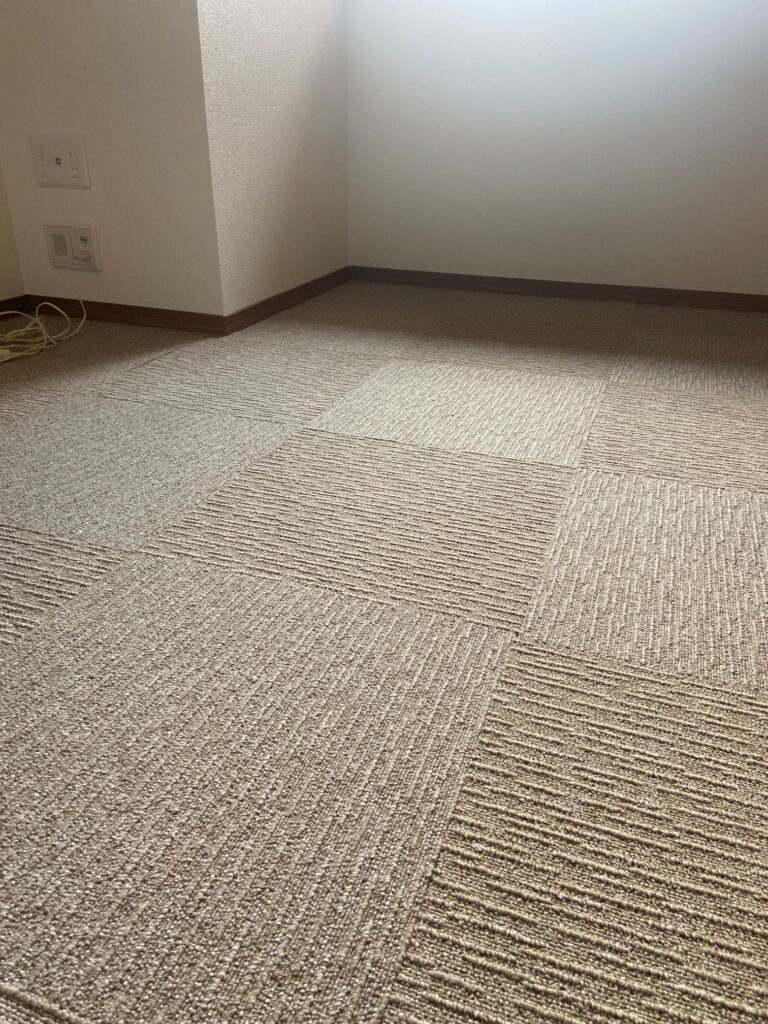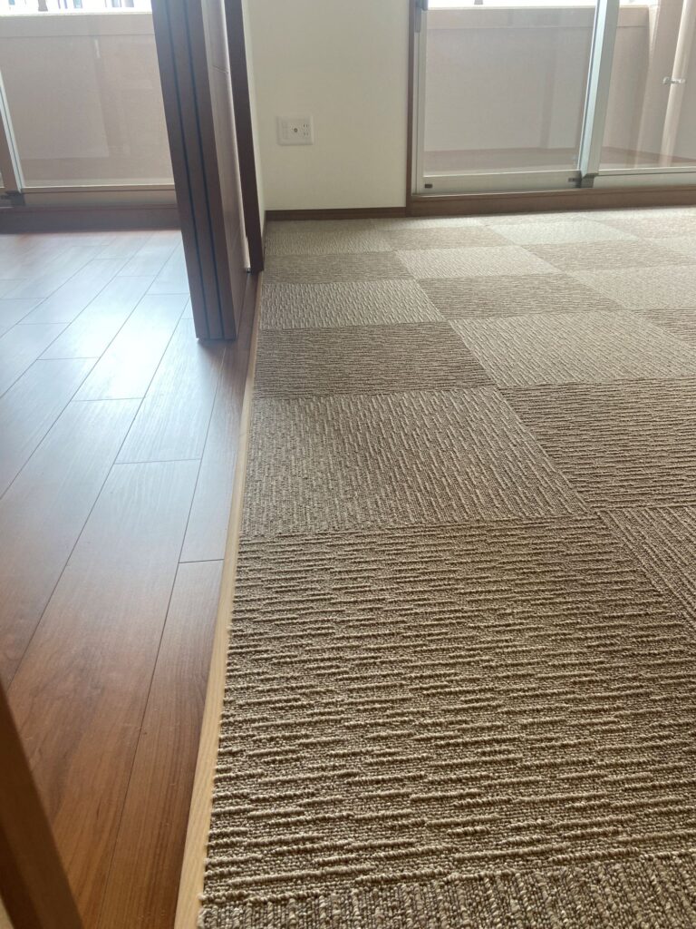 お引越しに伴いリビングと洋室のフローリングの床に接着剤いらずのタイルカーペットを施工させていただきました♪
