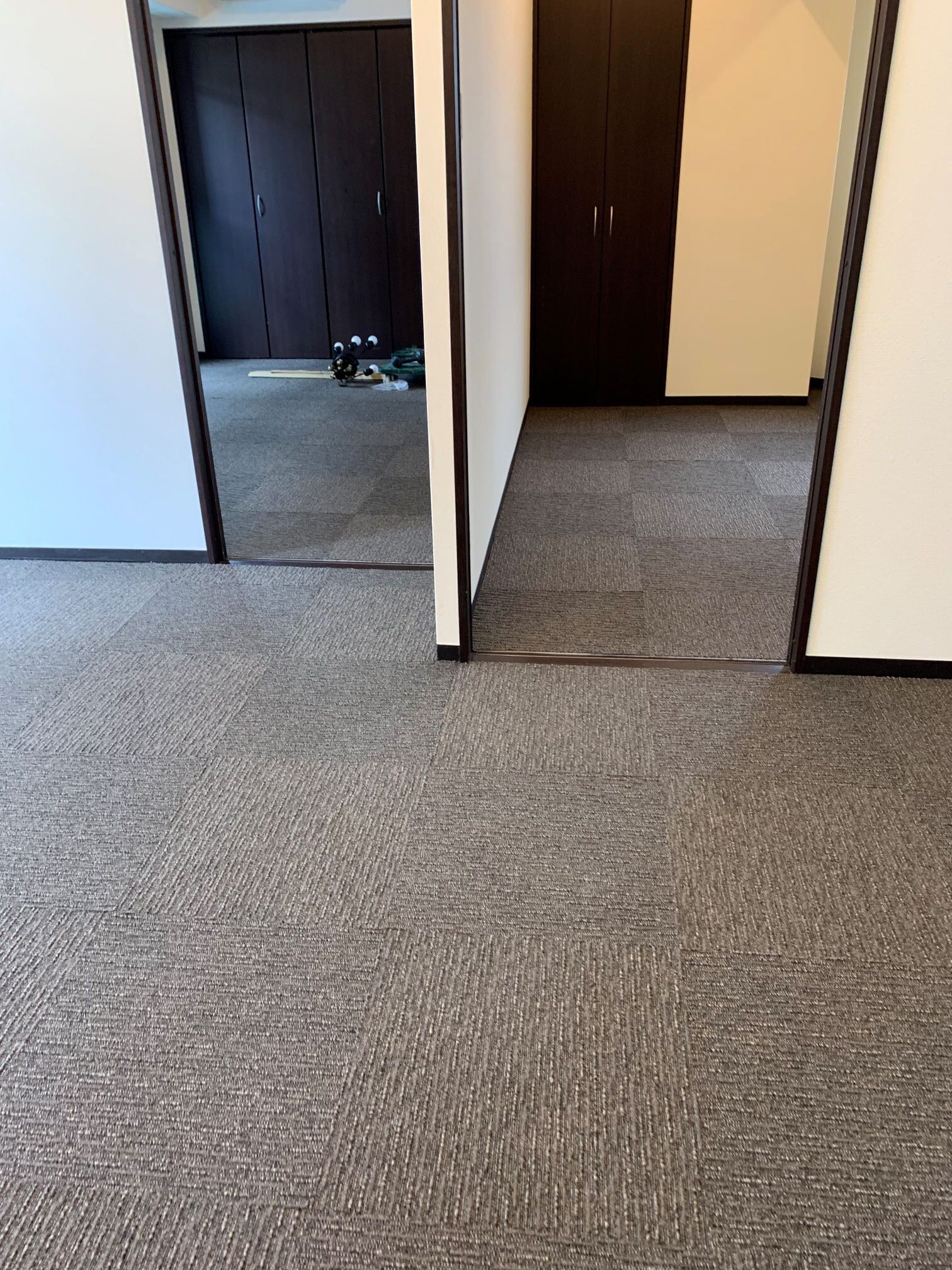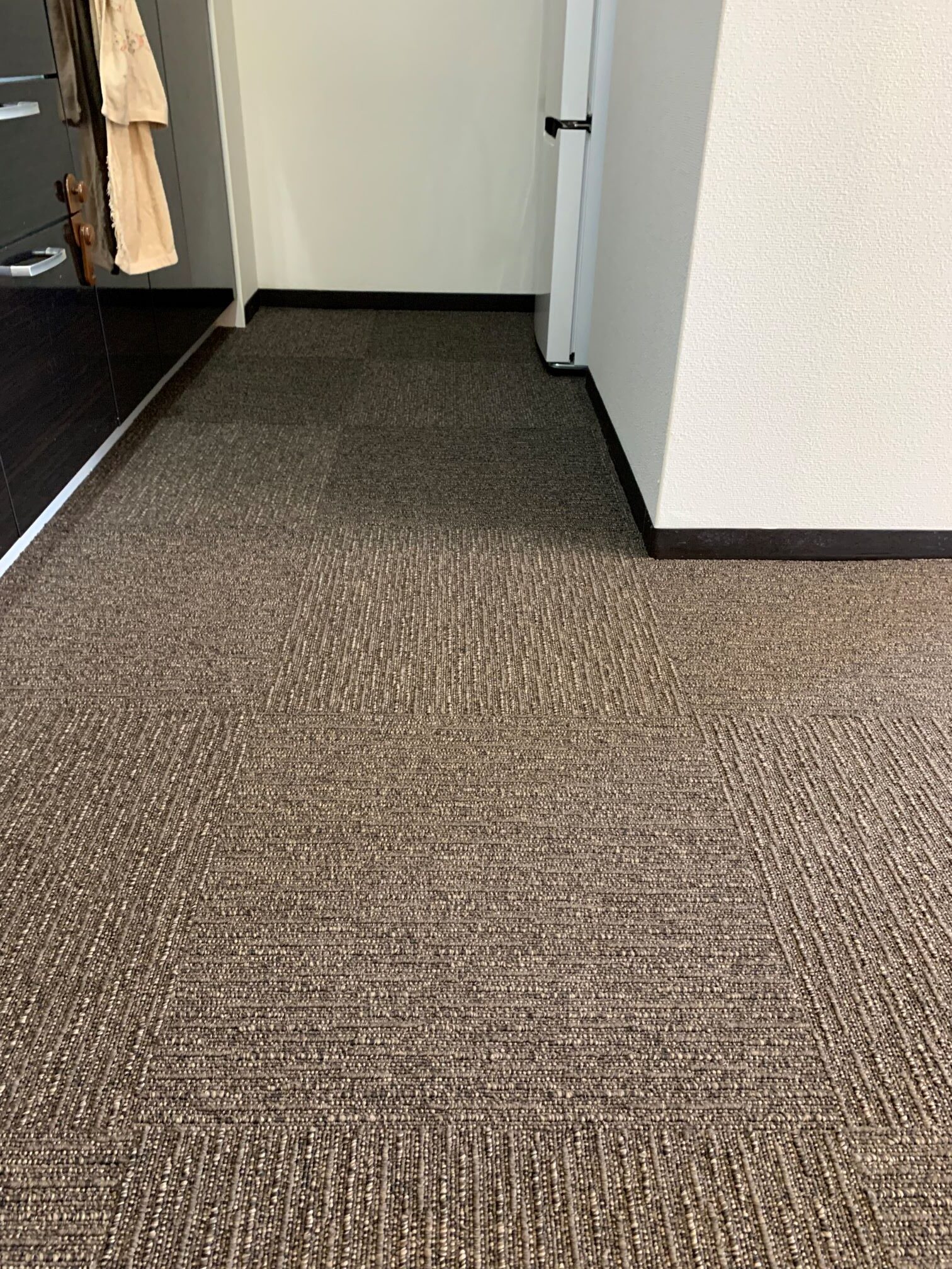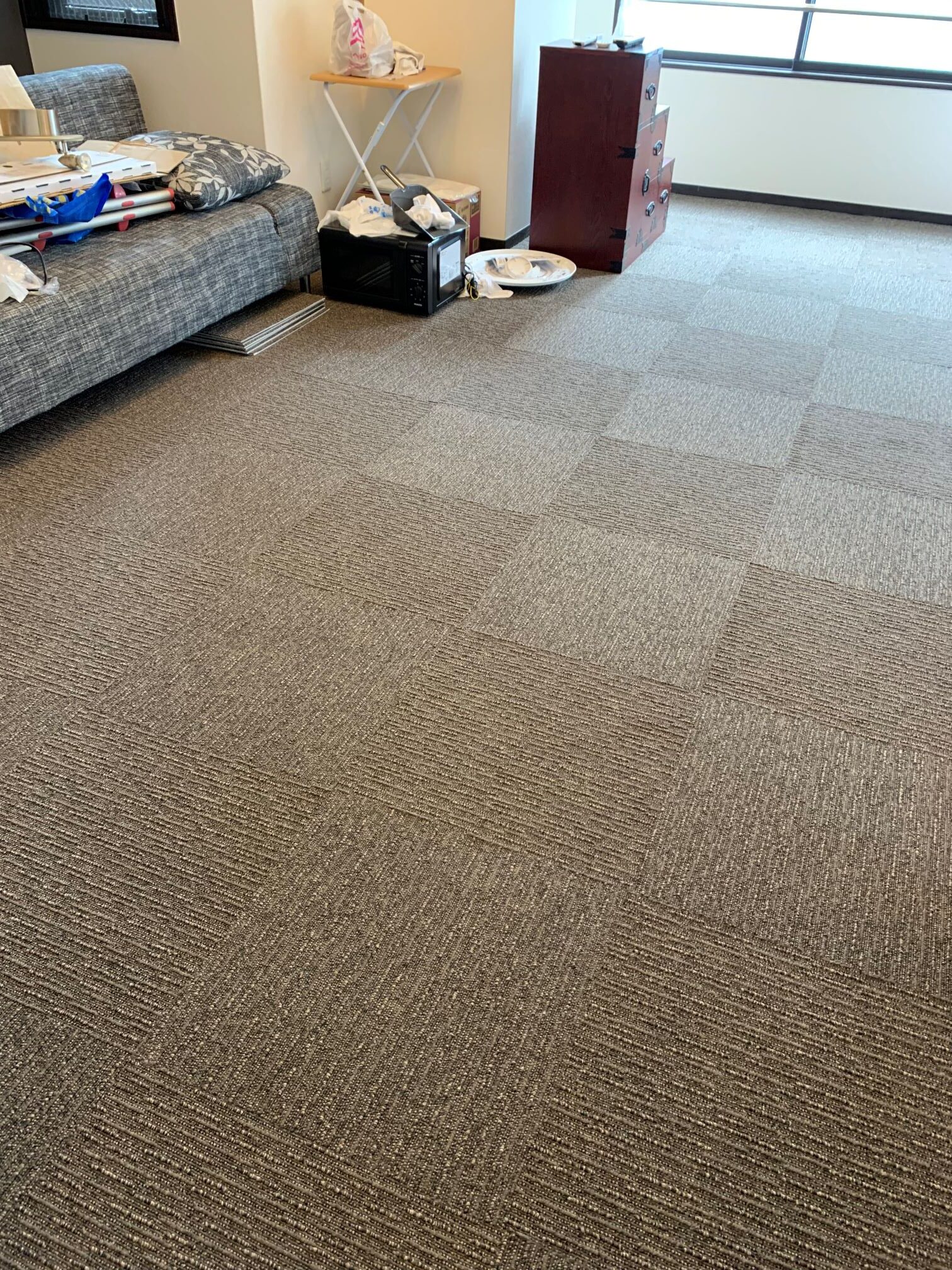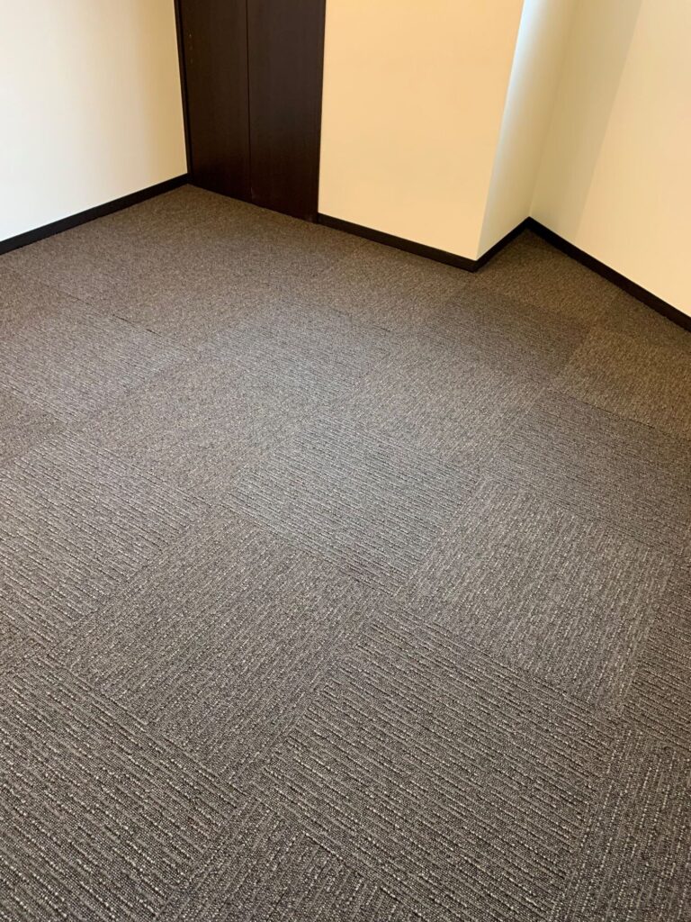 大阪市北区 S様邸 タイルカーペット施工例 フローリングの床に接着剤要らずのタイルカーペットを敷詰めにて施工させていただきました♪ 汚れたところだけいつでも外して洗えます。 ループに高低差がありナチュラルな雰囲気を演出! 東リ㈱ FF2102 約50㎡ 施工時間約2時間30分