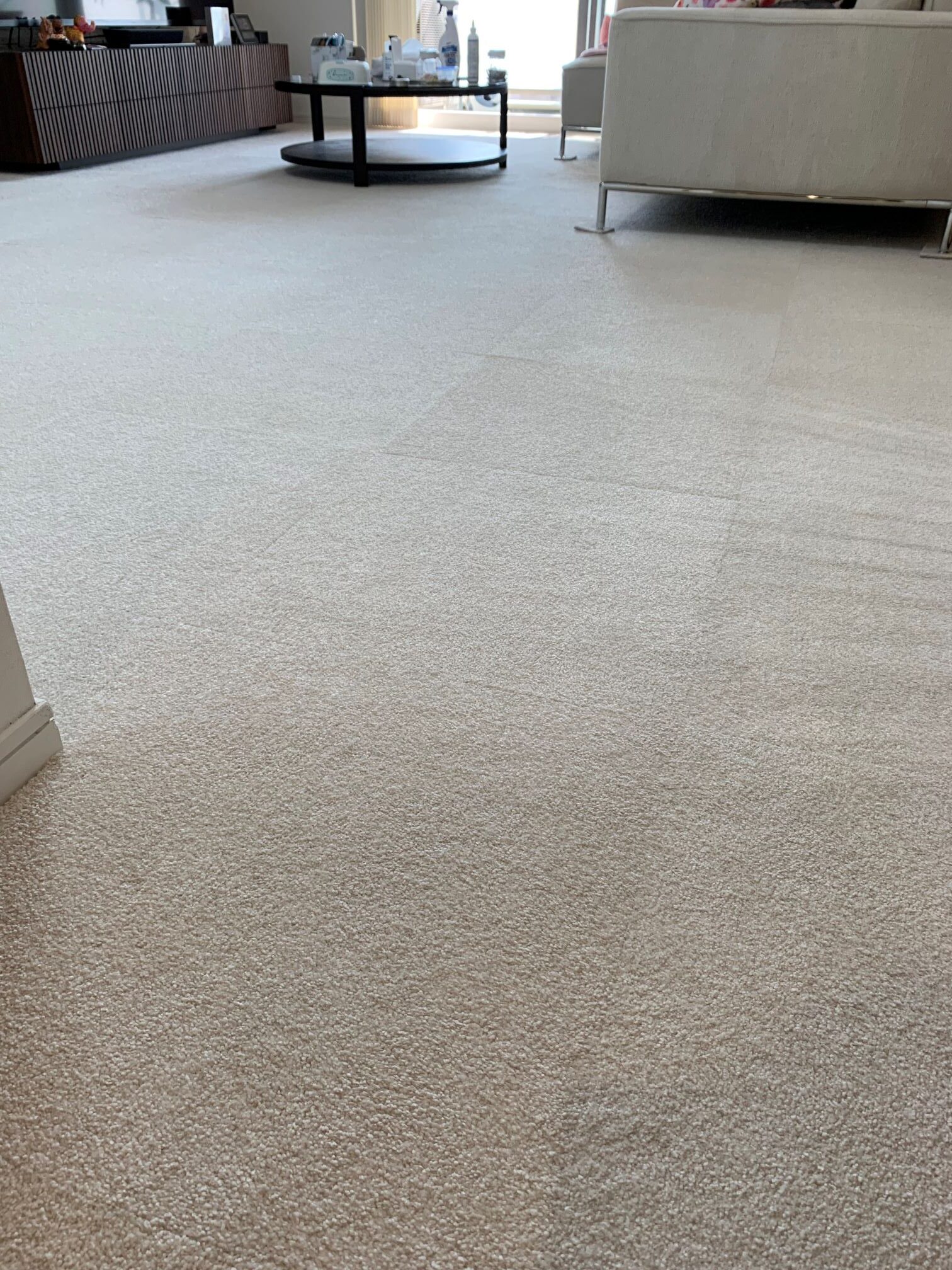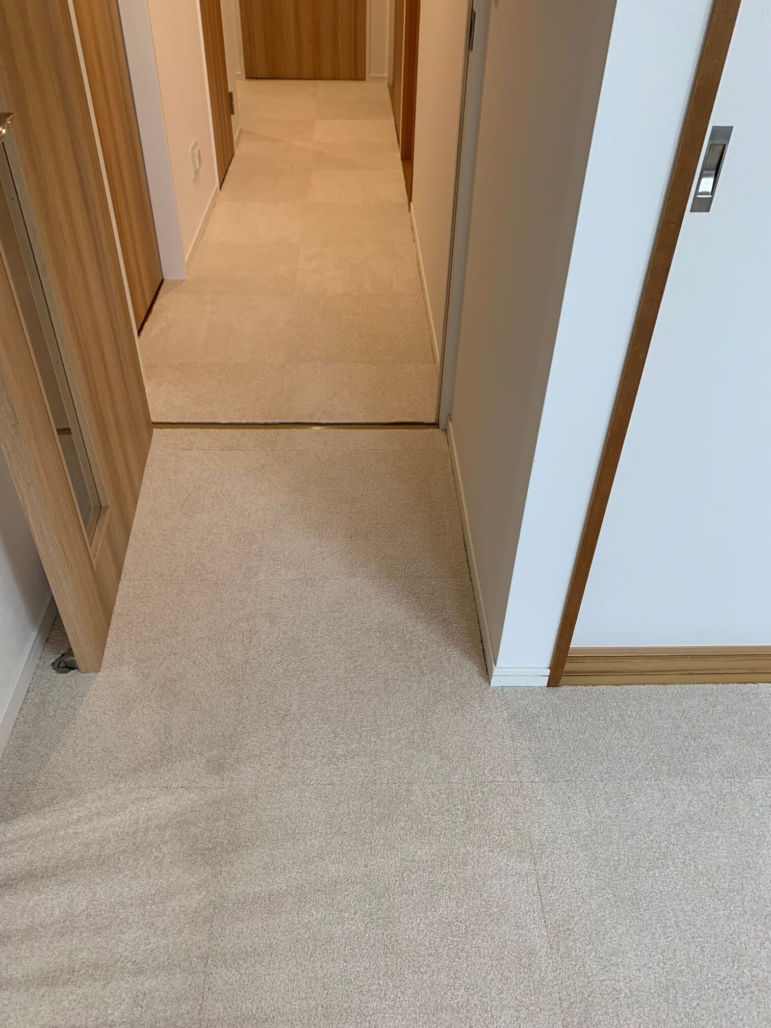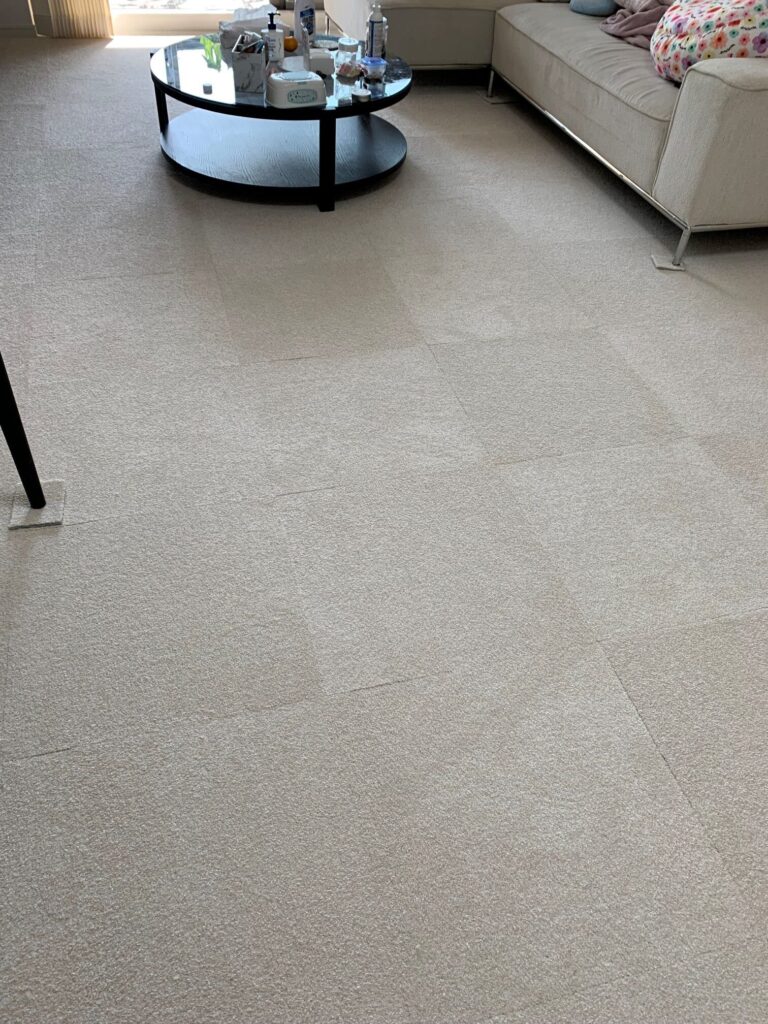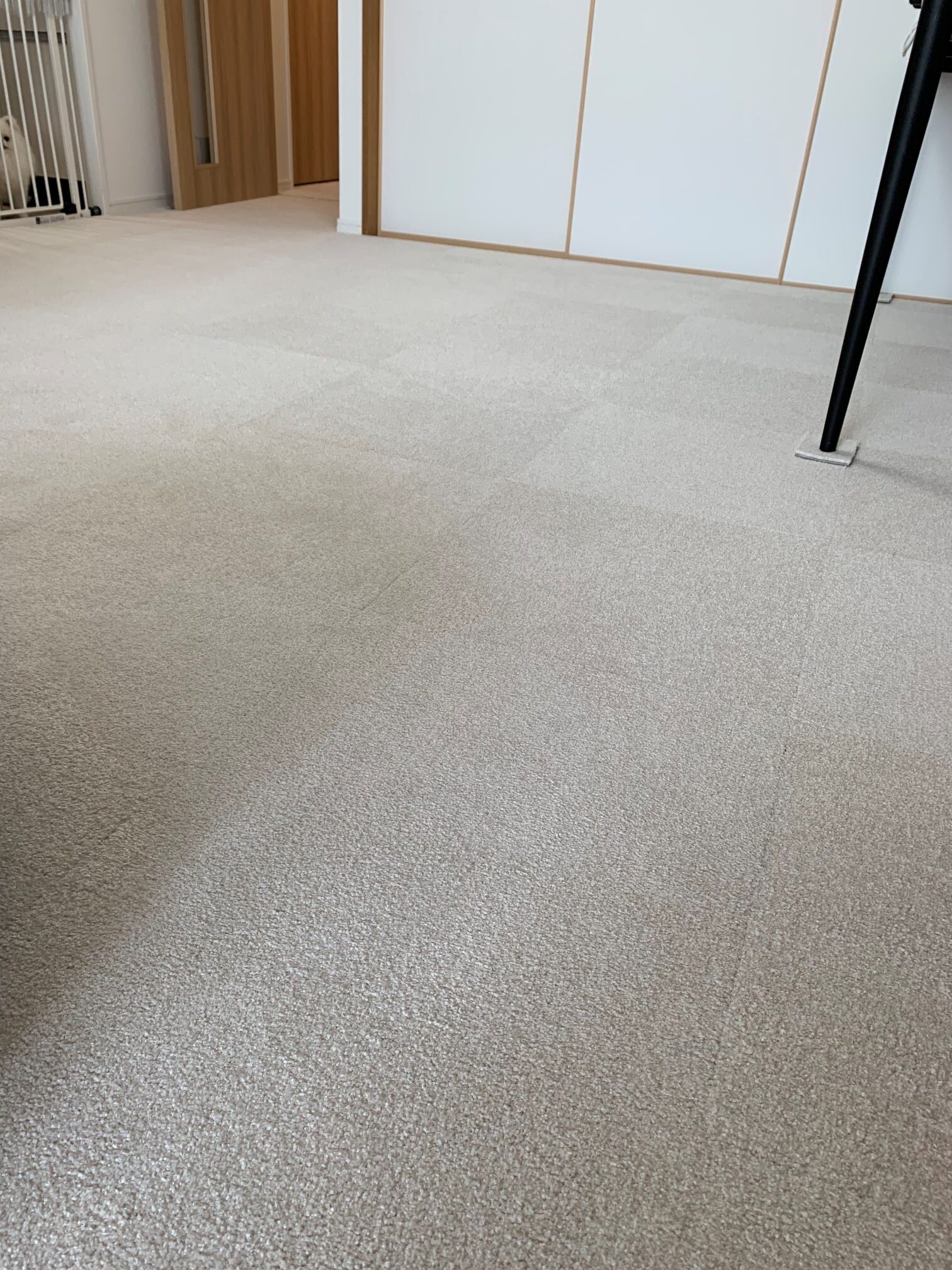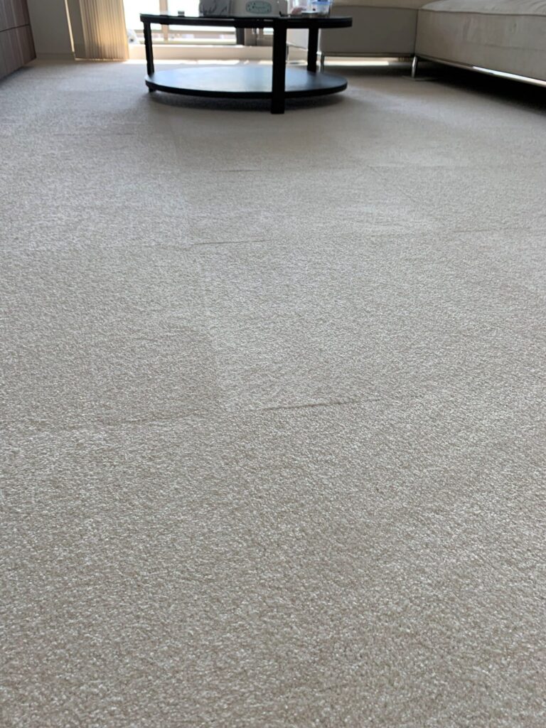 リビング、廊下のフローリングの床に家具を移動しながら接着剤いらずのタイルカーペットを敷詰めにて施工させていただきました♪