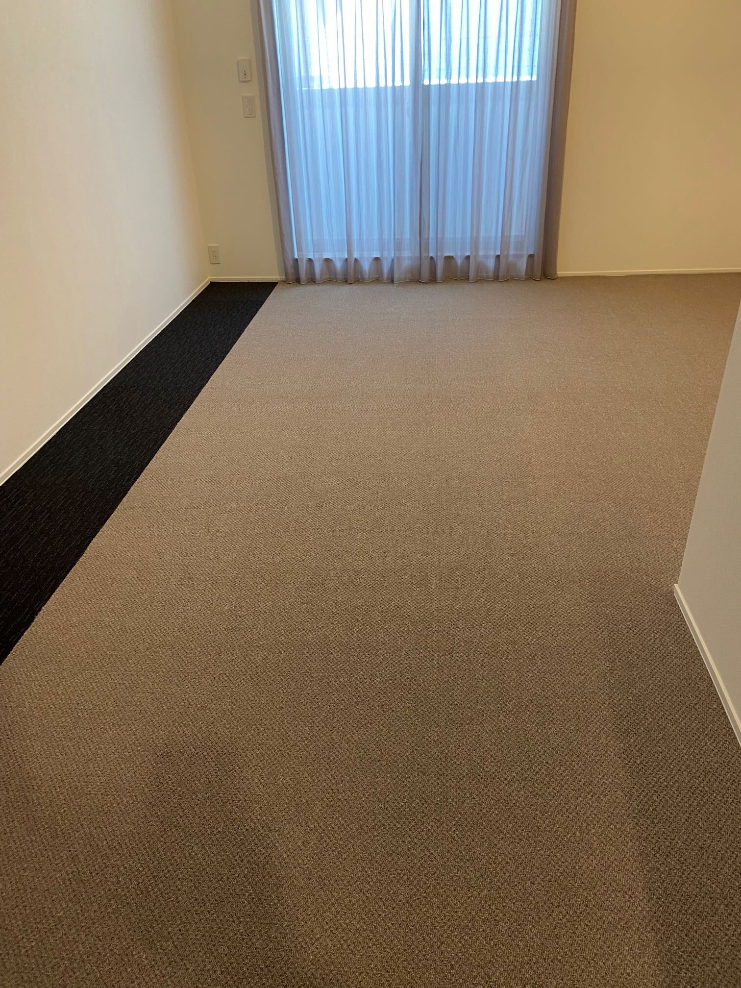 裏に特殊な遮音性能の高い高発泡ウレタンバッキングのカーペットを家具の置く場所にブラックのタイルカーペットを敷き残りのスペースに敷詰めさせていただきました。