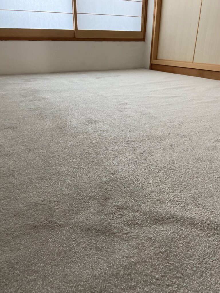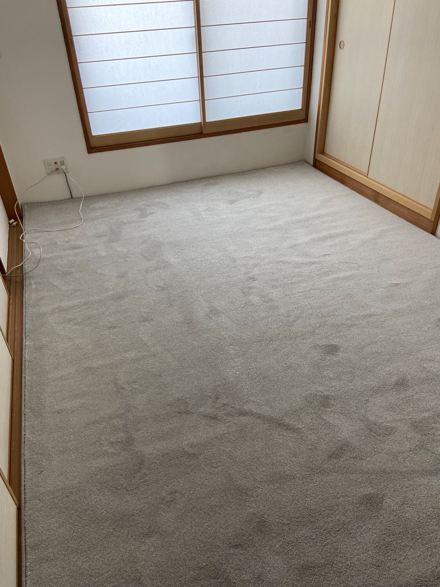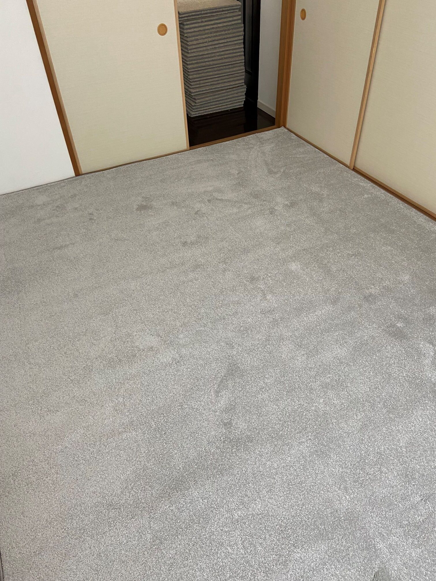 兵庫県西宮市 T様邸 オーダーカーペット施工例 和室の畳の上に現地採寸にて製作させていただきましたオーダーカーペットを施工させていただきました♪ 全厚16㎜のボリュームたっぷりの弾力感のあるカーペットにて。 アスワン㈱ アスノーチェ NOC-92 2470x3400㎜ 施工時間訳15分