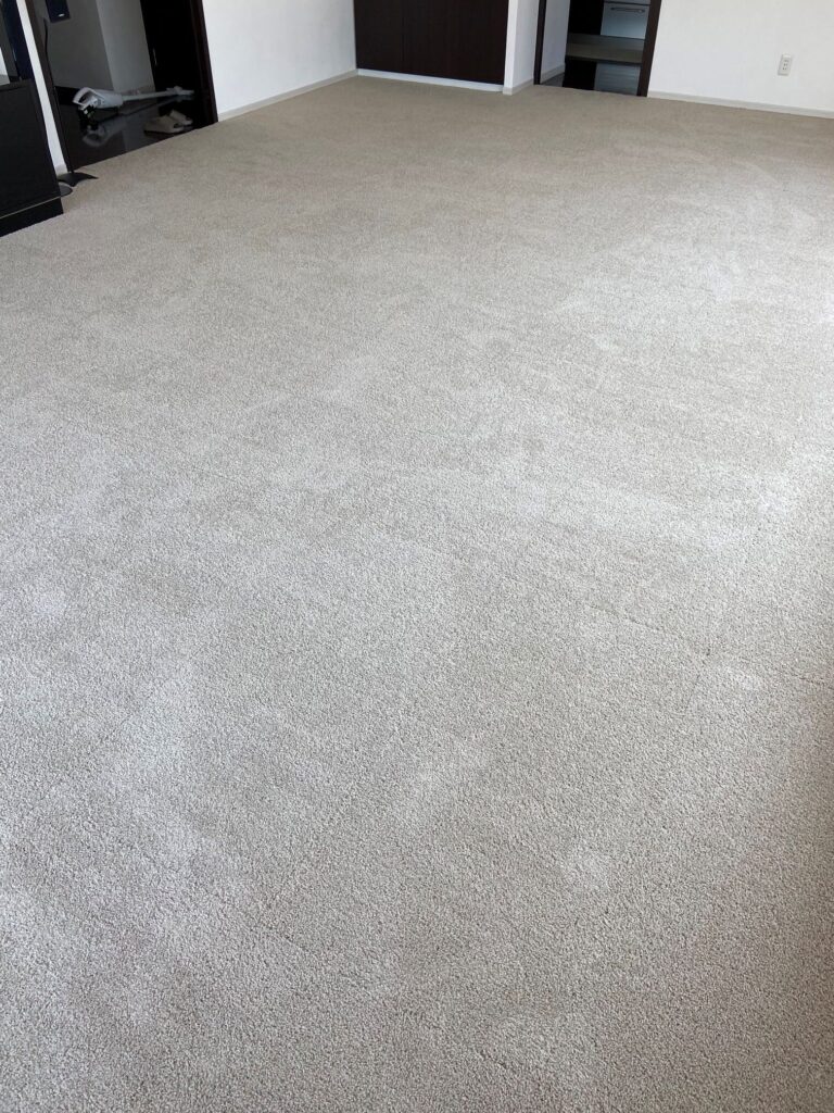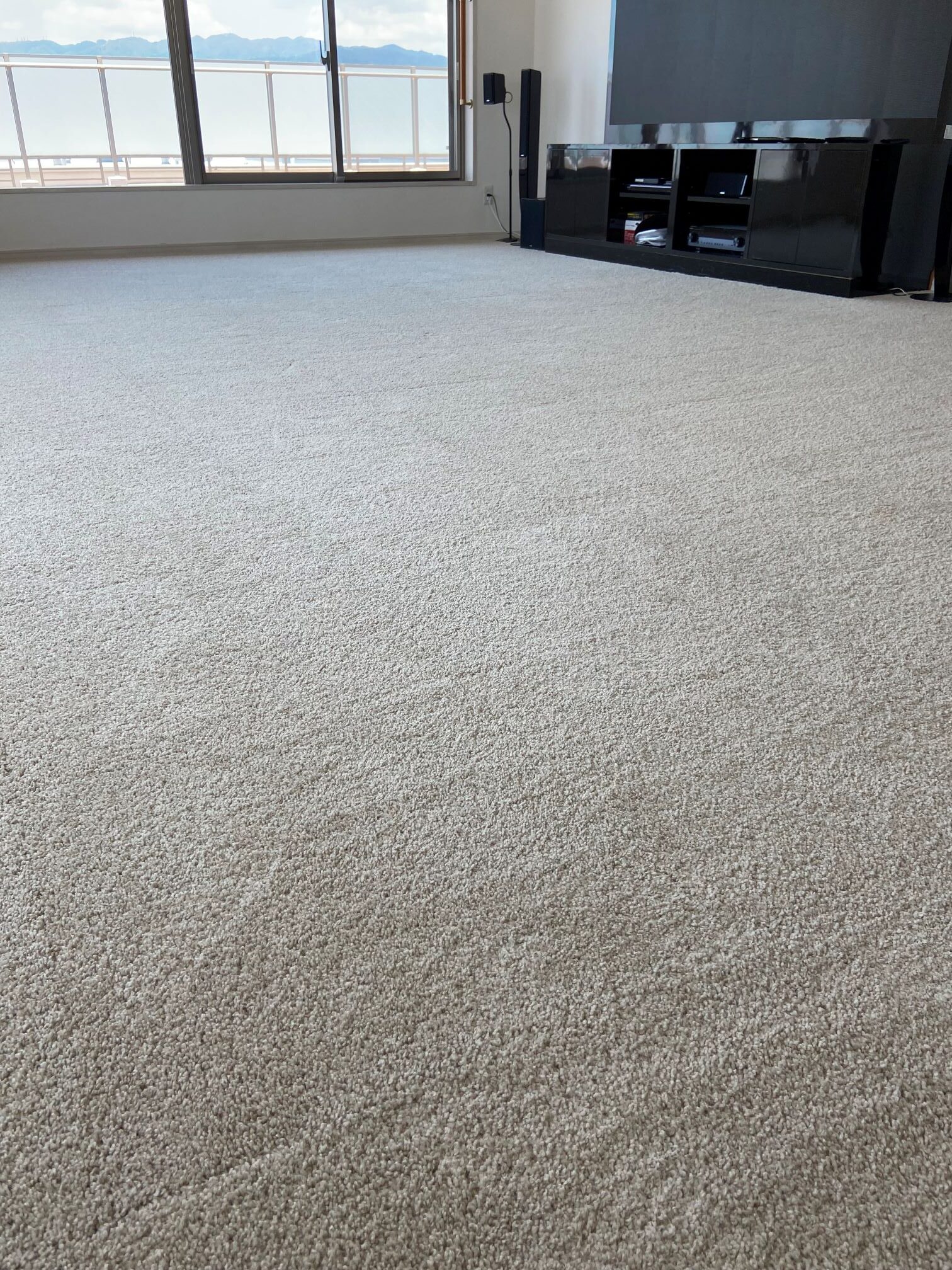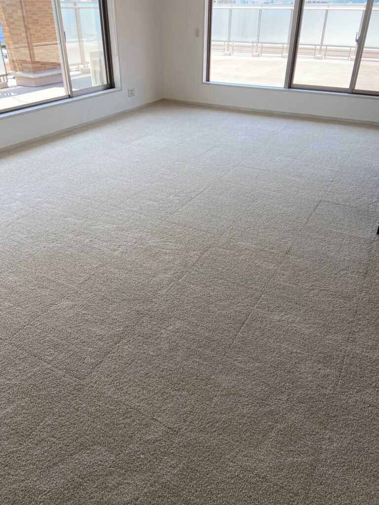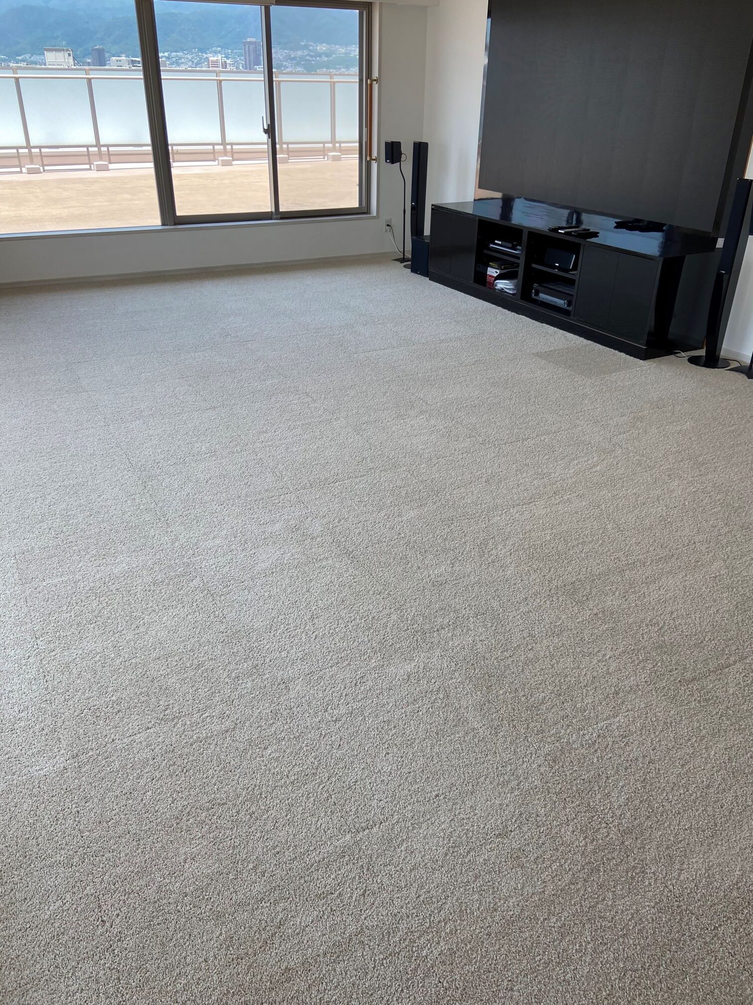 兵庫県西宮市 T様邸 タイルカーペット施工例 お引越し前にリビングのフローリングの床に接着剤いらずのタイルカーペットを施工させていただきました♪ シャギータイプの踏み心地抜群のタイルカーペットにて。 ㈱川島織物セルコン ユニットラグ UR1470 約40㎡ 施工時間約2時間