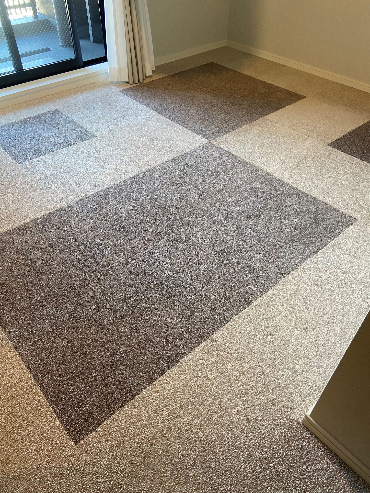 洋室のフローリングの床に接着剤いらずのタイルカーペットを施工させていただきました♪