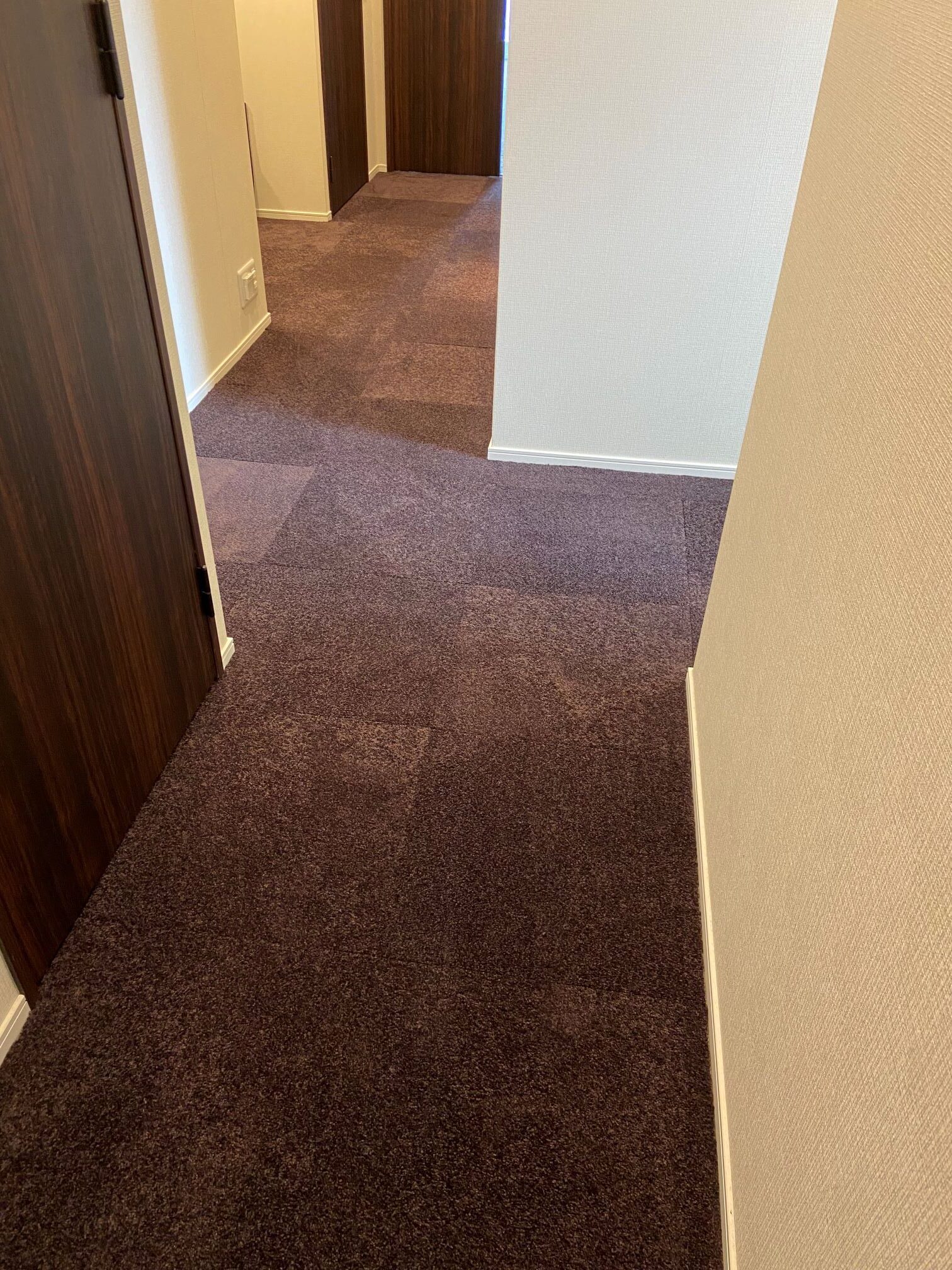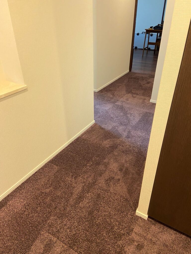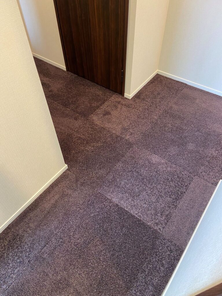 フローリングの洋間、大理石貼りの廊下、洗面脱衣場に接着剤いらずのタイルカーペットを施工させていただきました♪