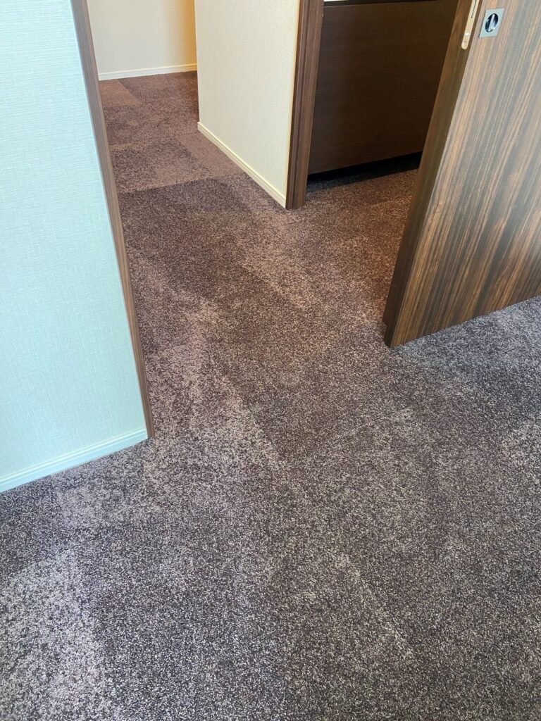 シリーズの中でも最も肌触りがいいカットパイルのカーペットにて。職人さんによる現地でのカット合わせにて隙間なく施工。