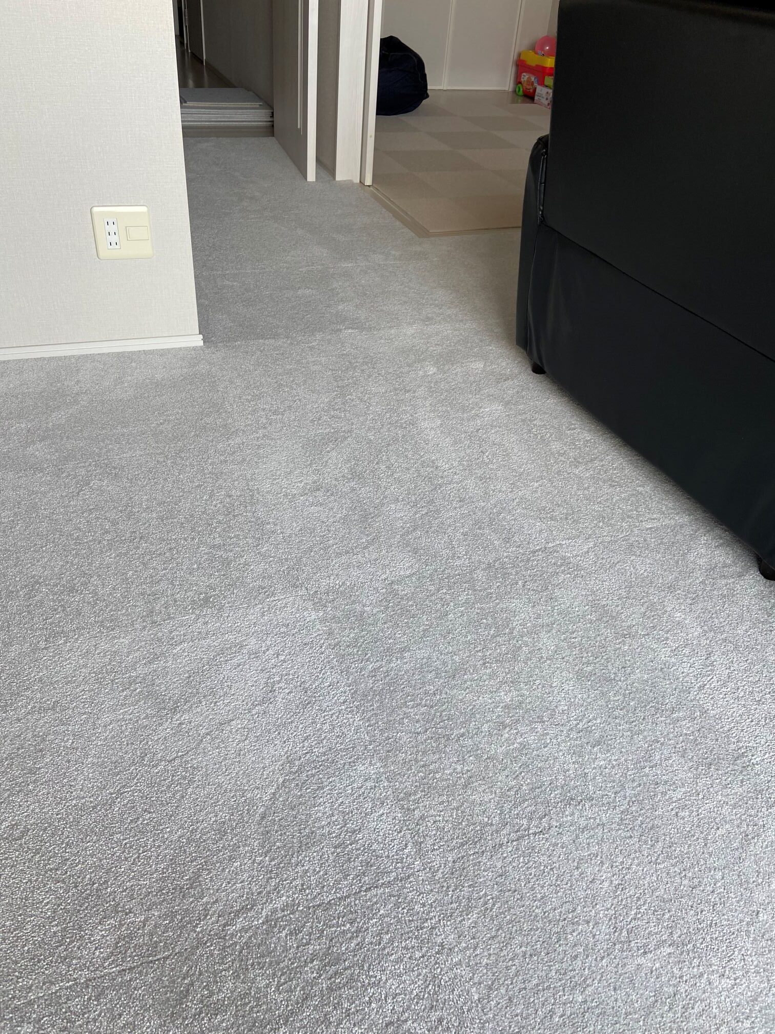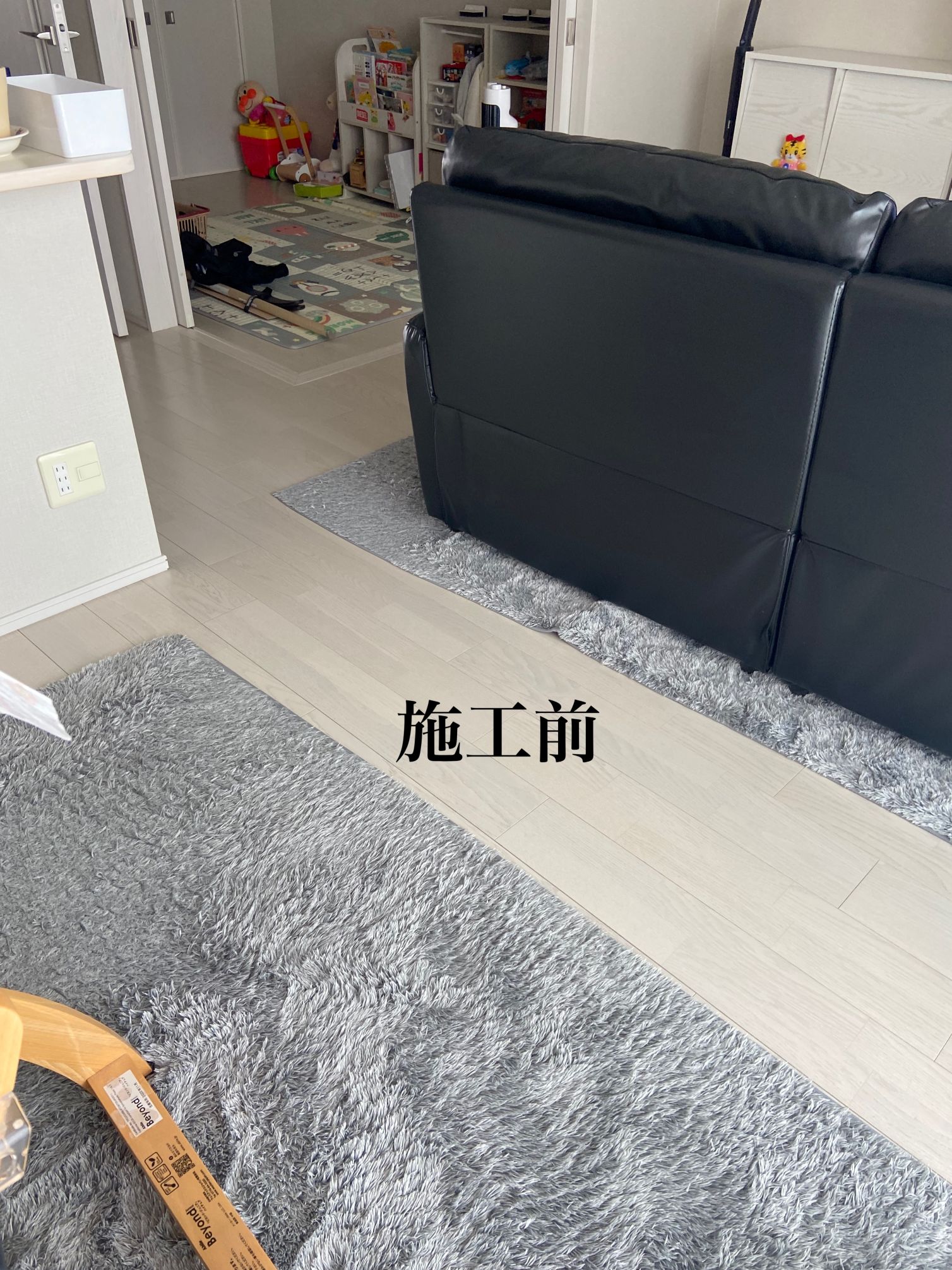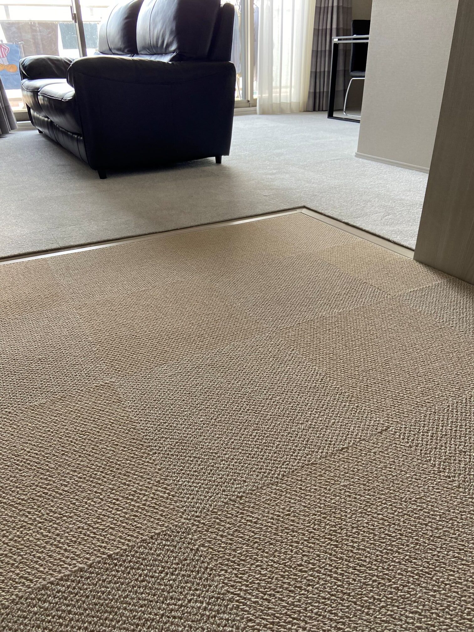リビング、洋間x1室のフローリングの床に接着剤要らずのタイルカーペットを家具などを移動しながら施工させていただきました♪