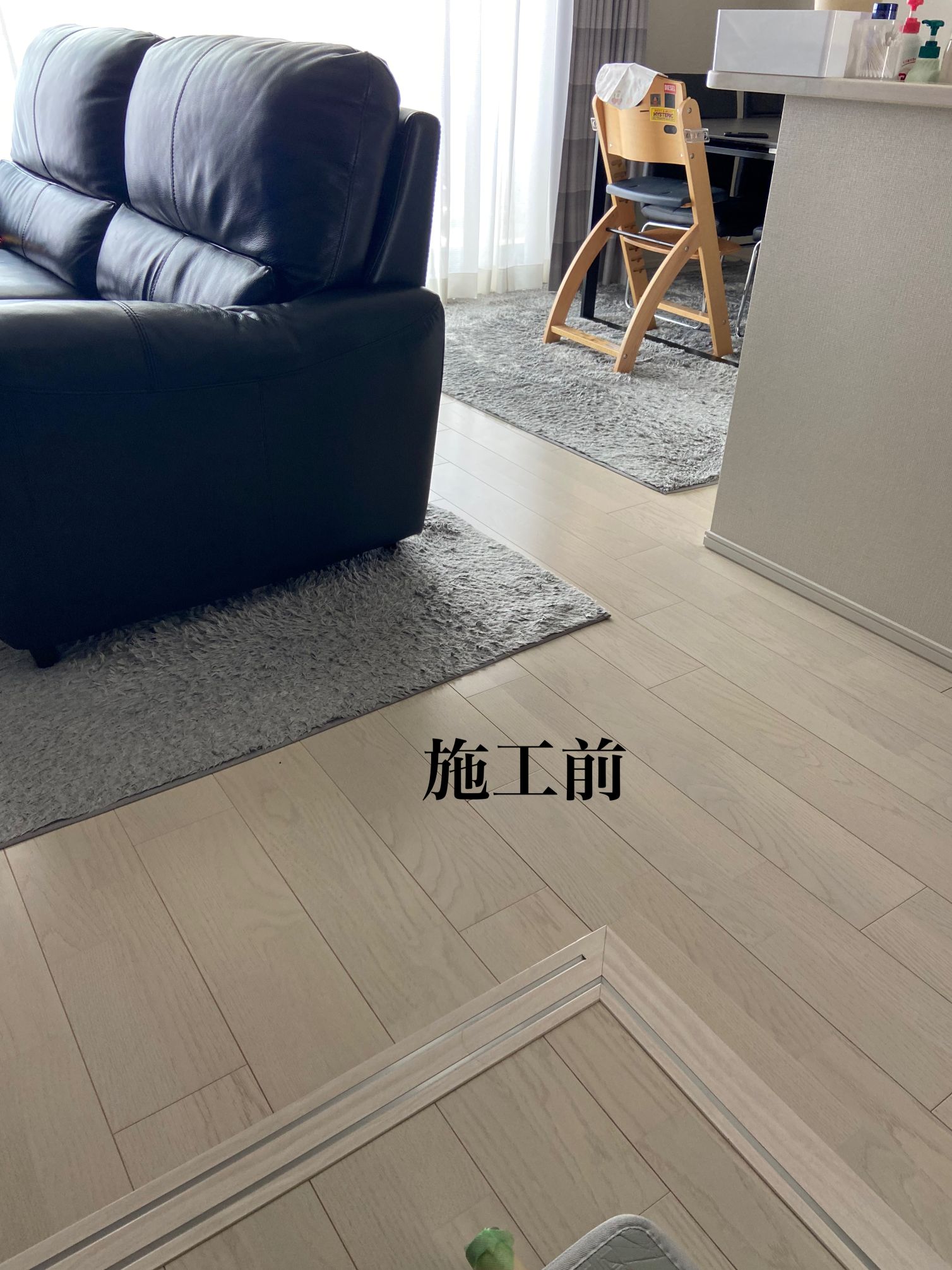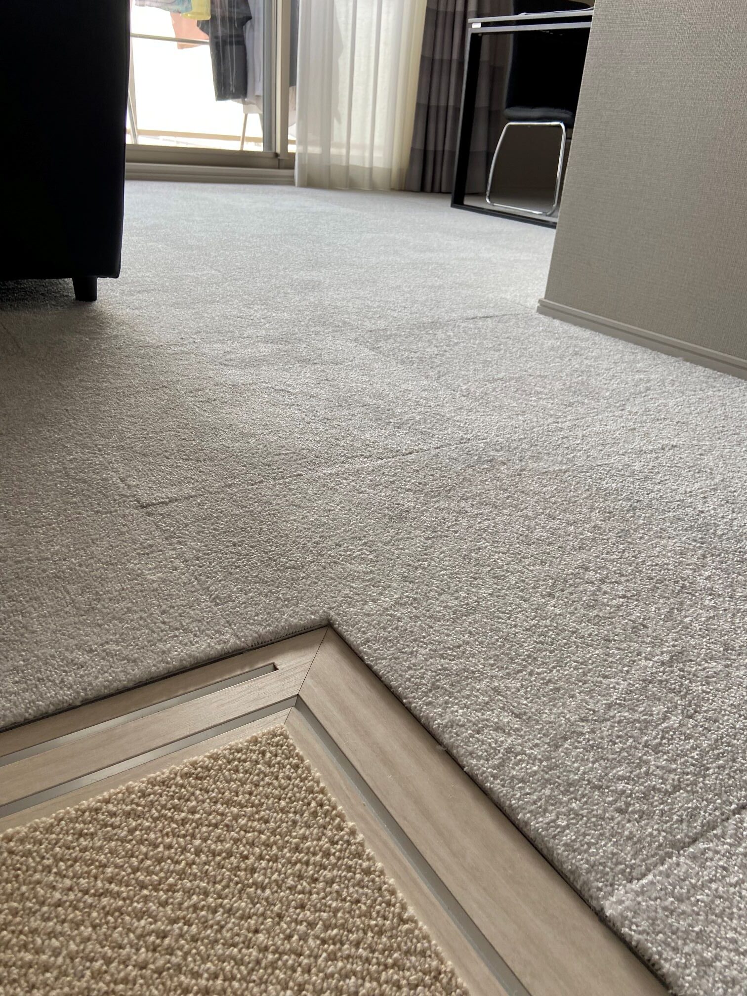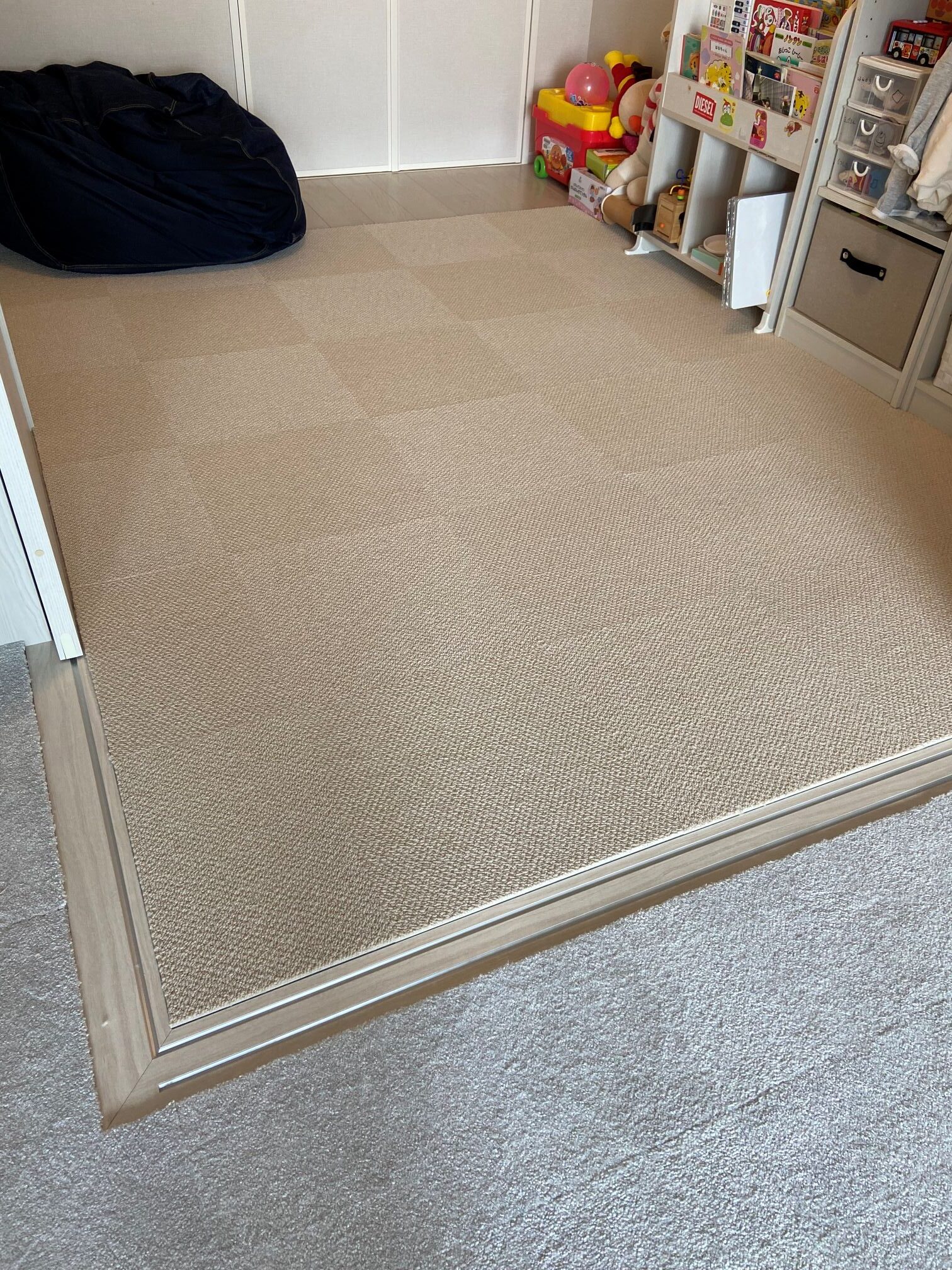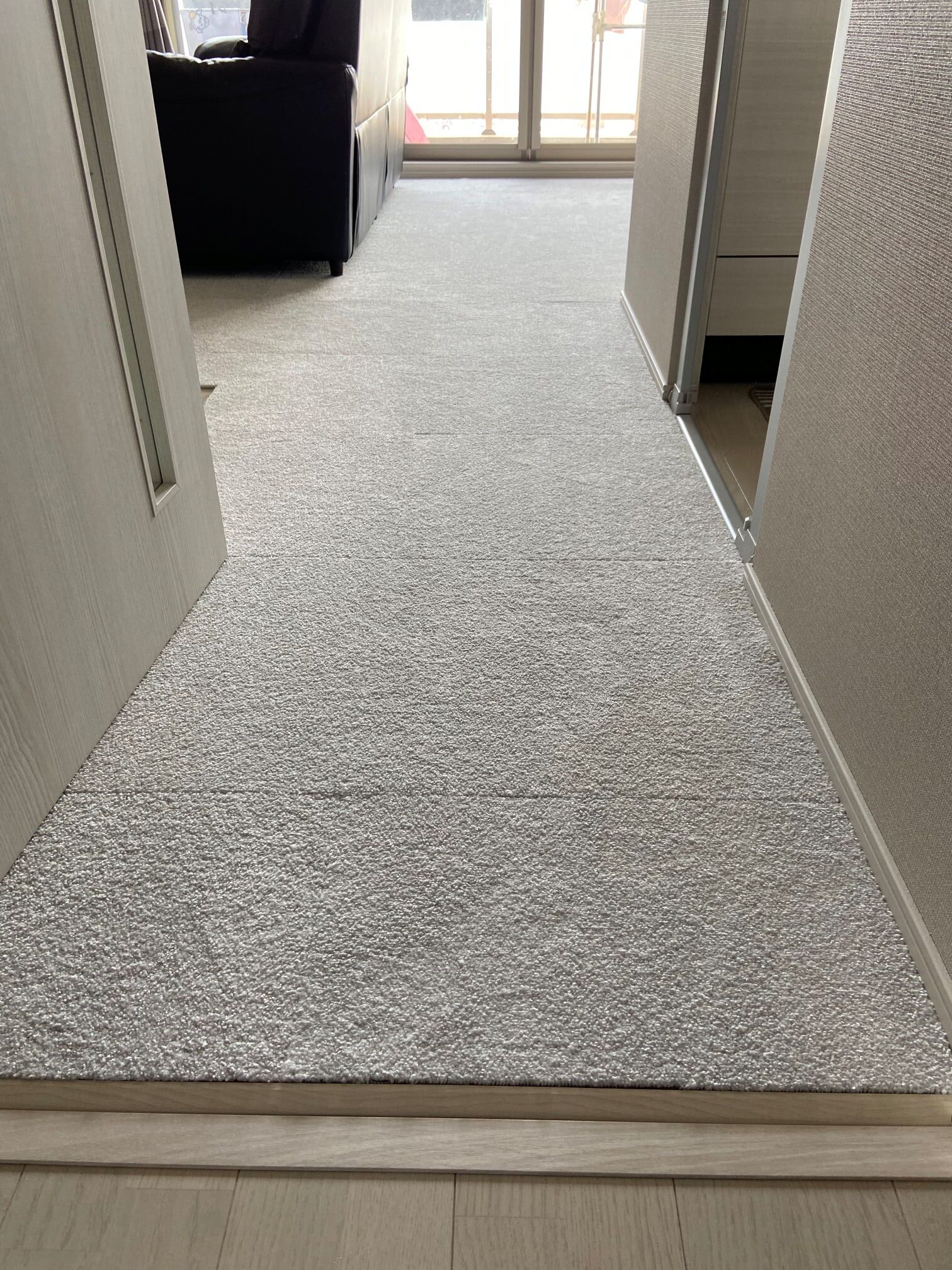 リビング、洋間x1室のフローリングの床に接着剤要らずのタイルカーペットを家具などを移動しながら施工させていただきました♪