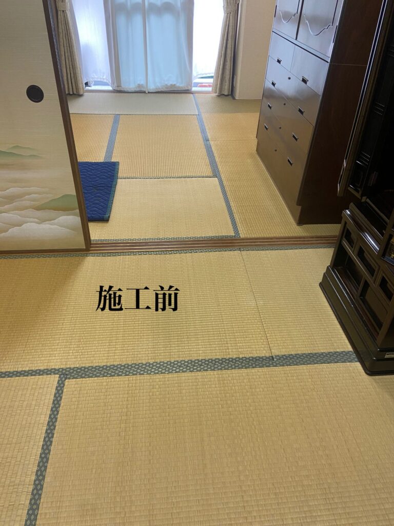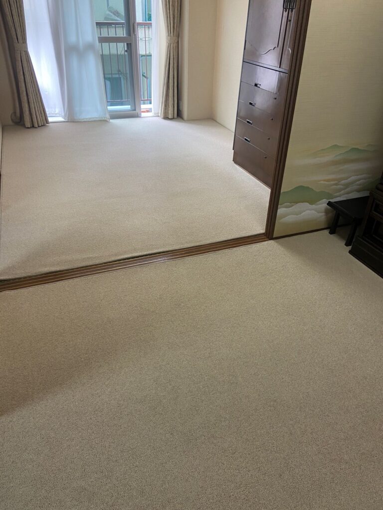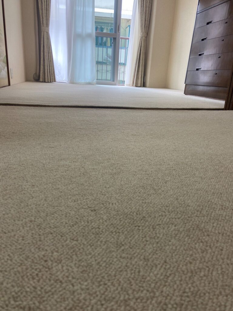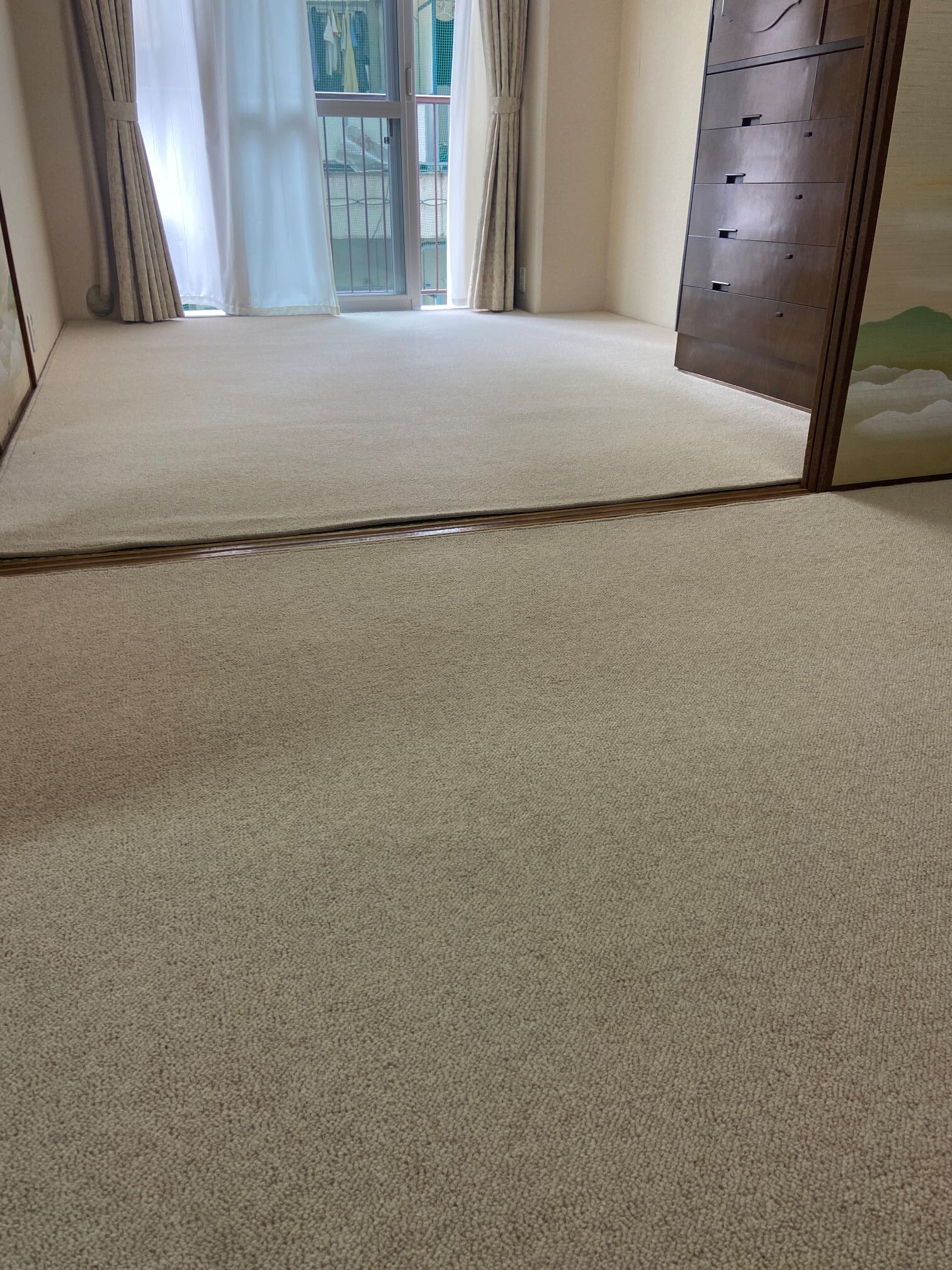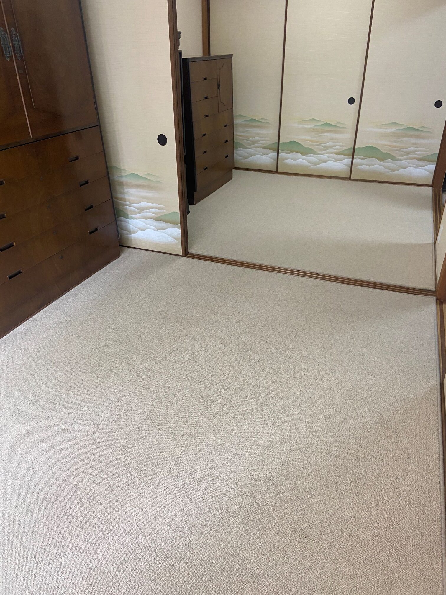 和室の畳の上に現地採寸にて製作させていただきましたオーダーカーペットを家具を移動しながら施工させていただきました♪
