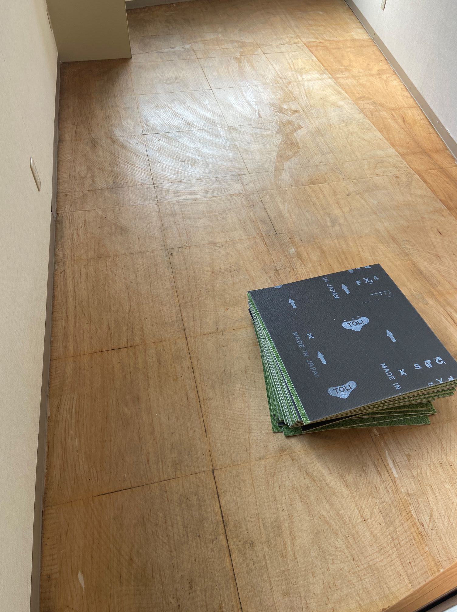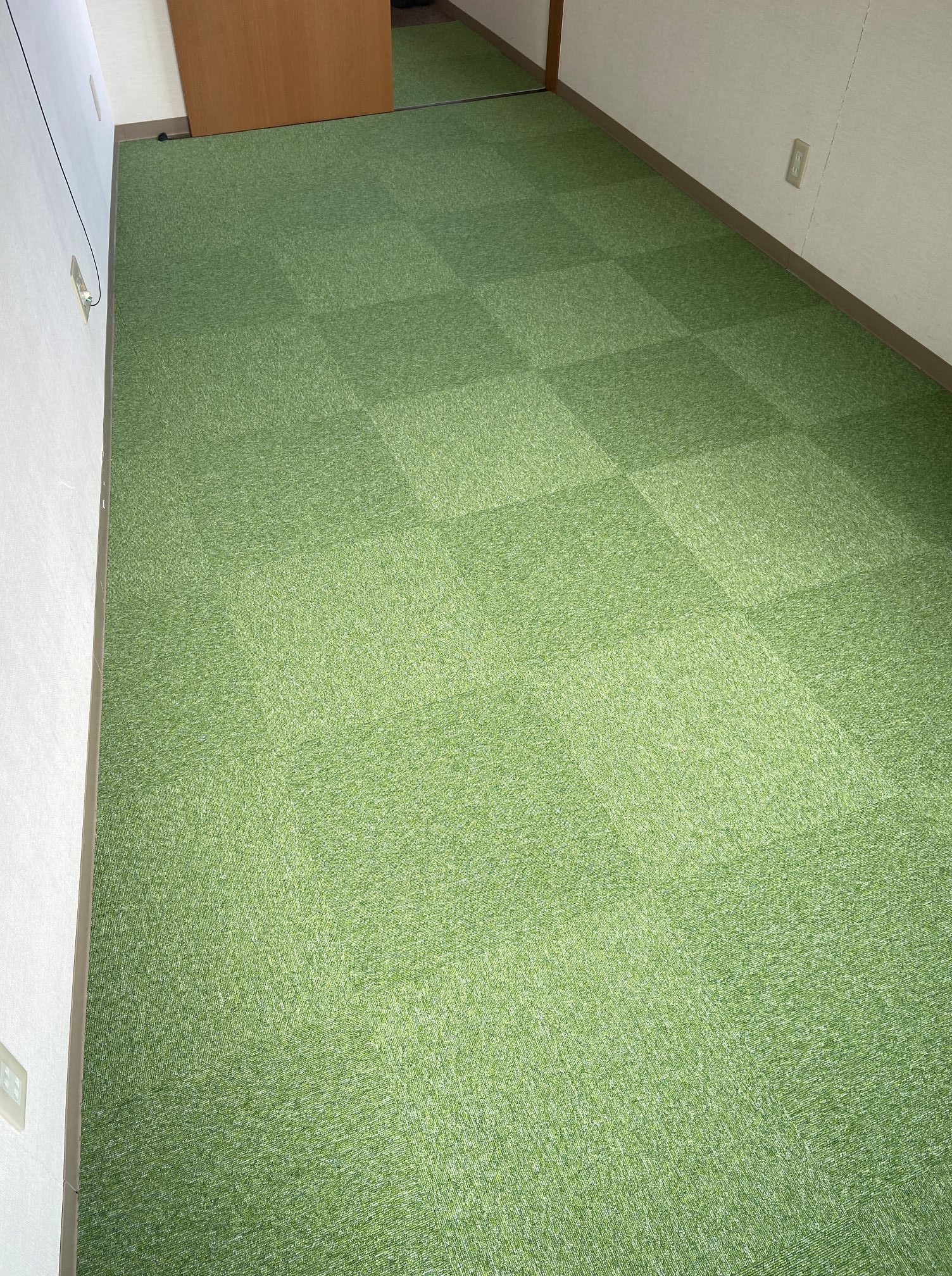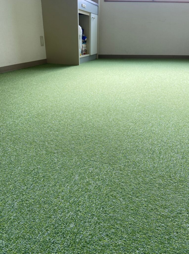 大阪市此花区 某会社様 タイルカーペット施工例 某会社様の事務所のタイルカーペットを貼り替えさせていただきました♪ 明るいグリーン色で室内が明るくなったと喜んでいただきました。 東リ㈱ GA1051 約14㎡ 施工時間約1時間30分
