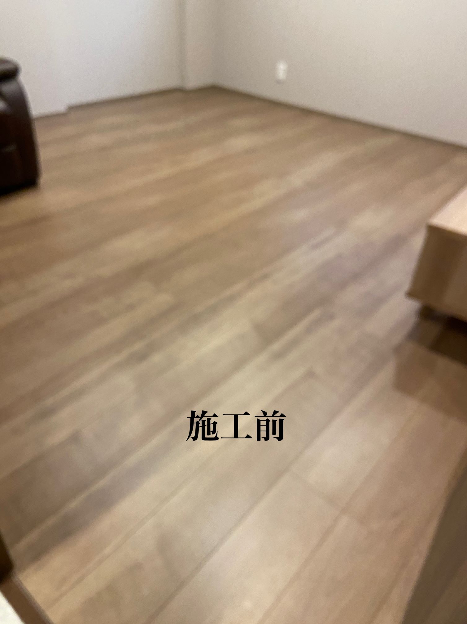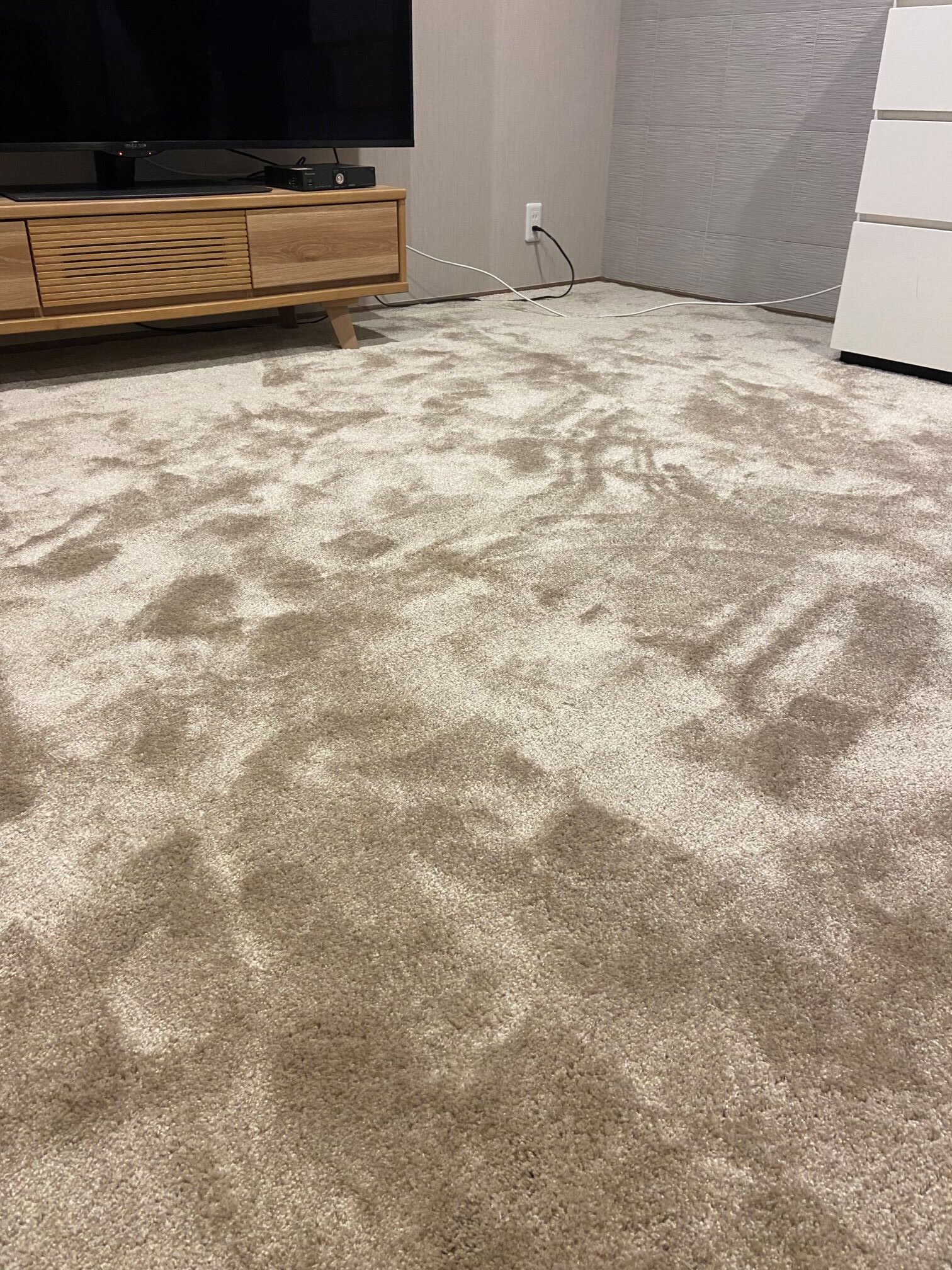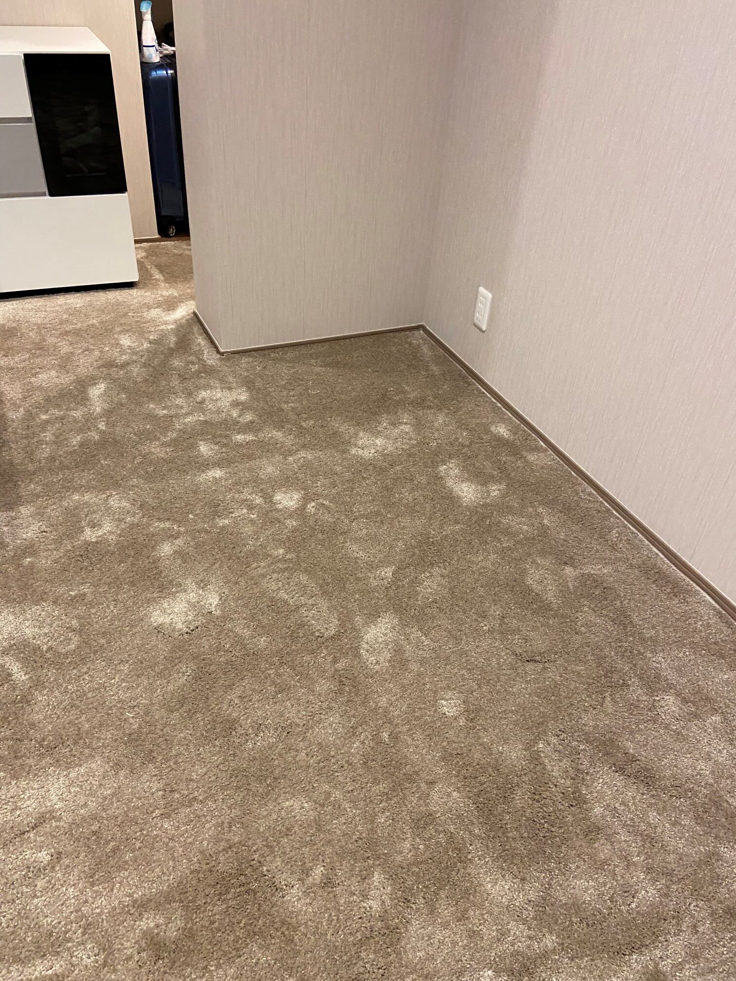 洋室のフローリングの床に現地採寸にて製作させていただきましたオーダーカーペットを家具を移動しながら施工させていただきました♪