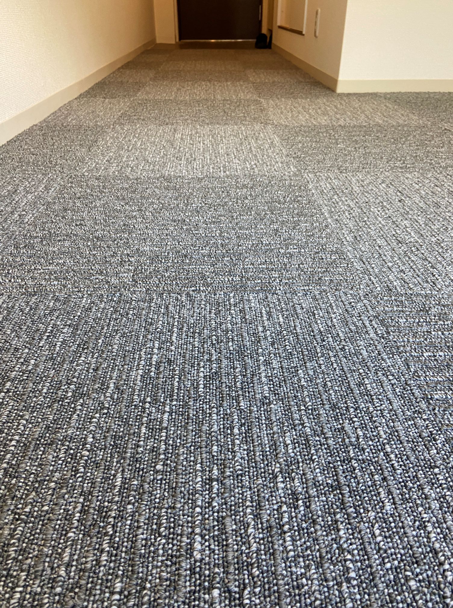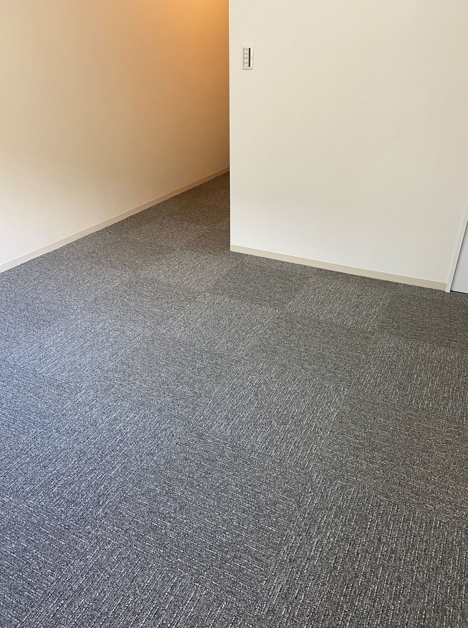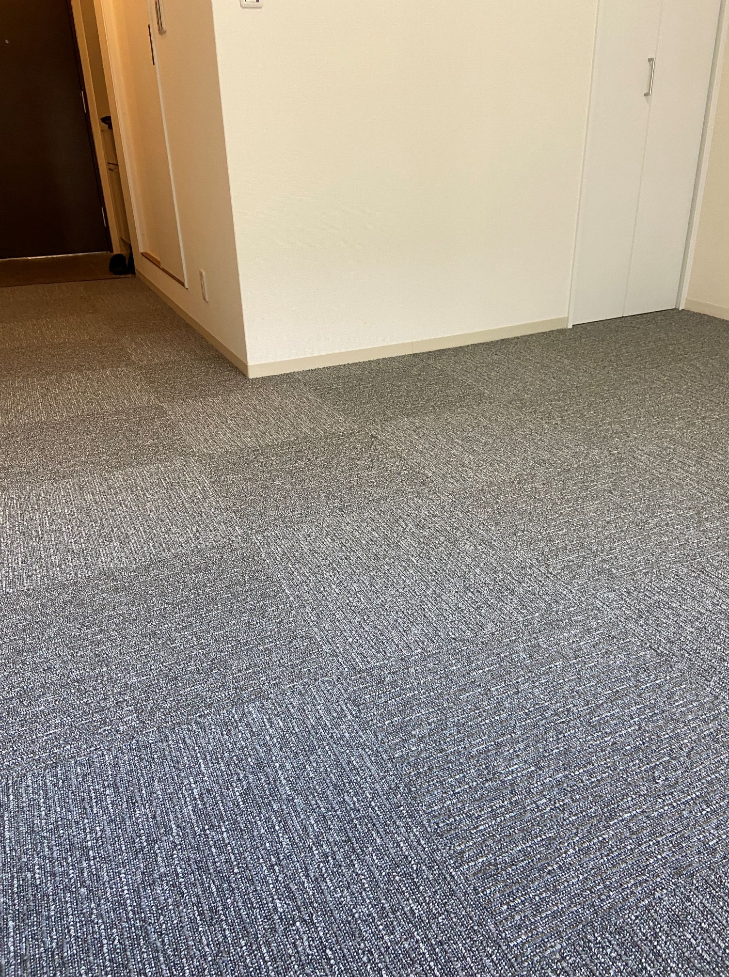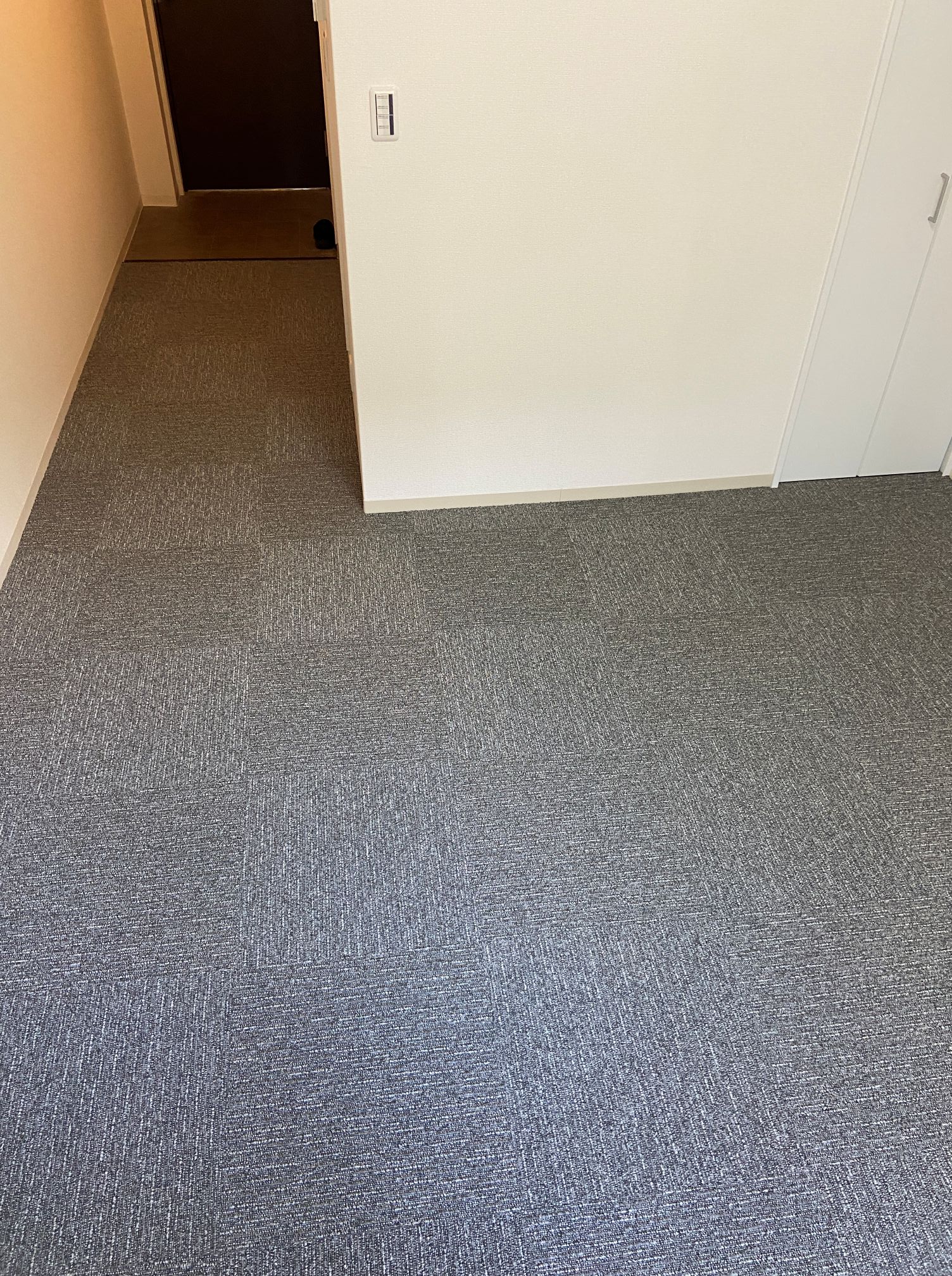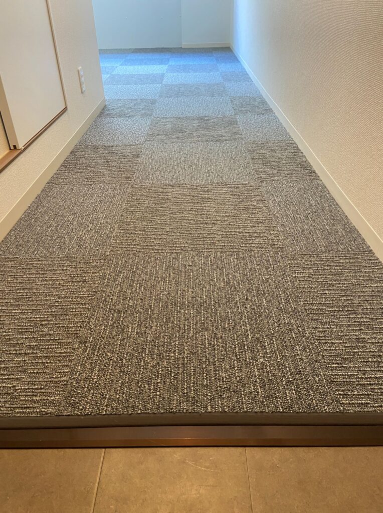 ワンルームマンションのクッションフロアーの床に接着剤いらずのタイルカーペットを施工させていただきました♪