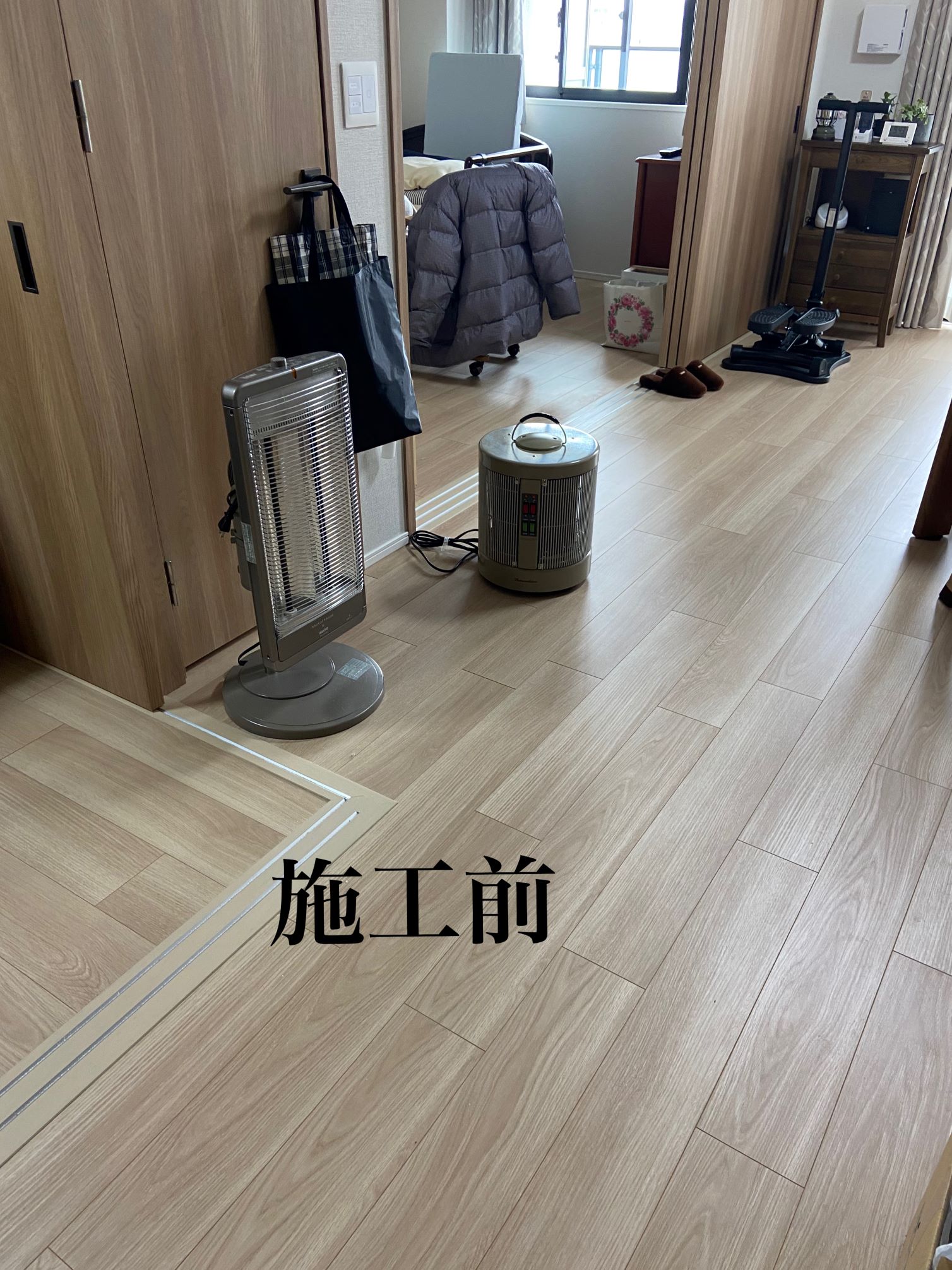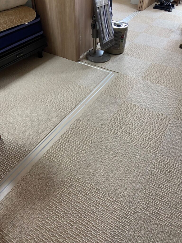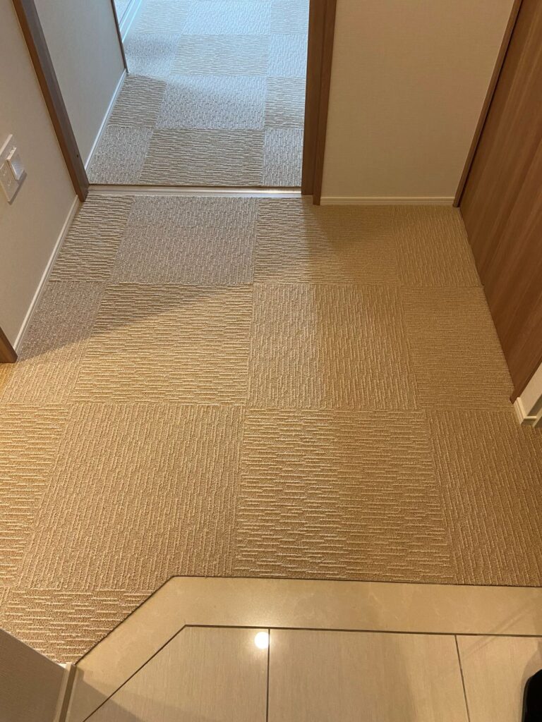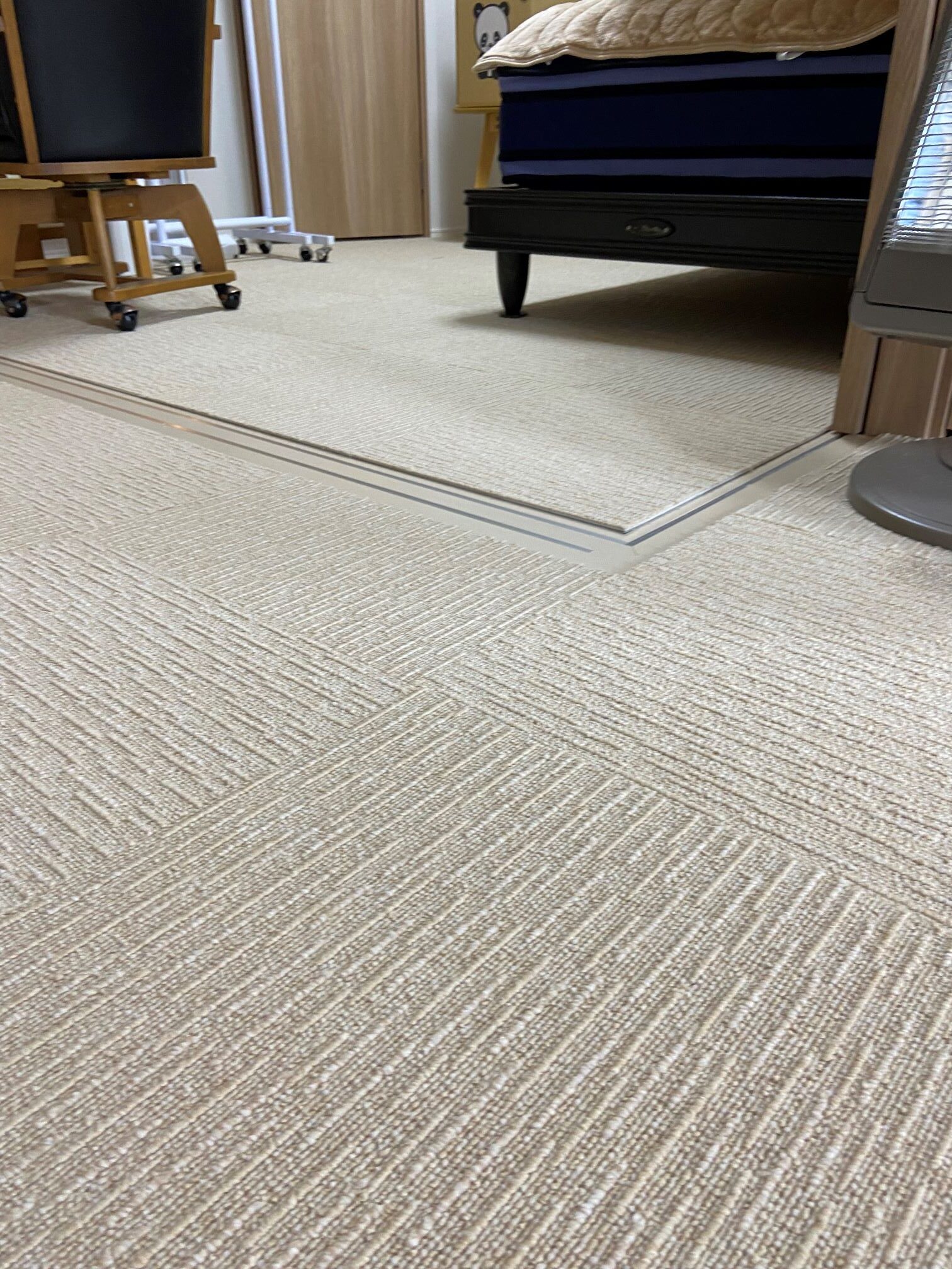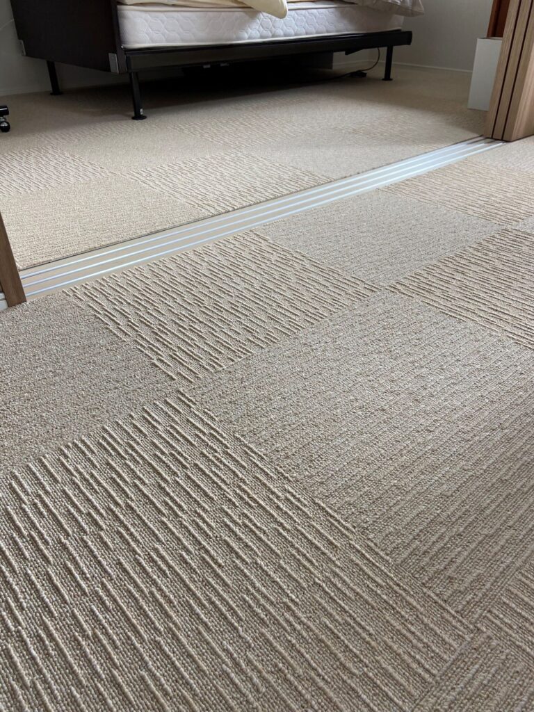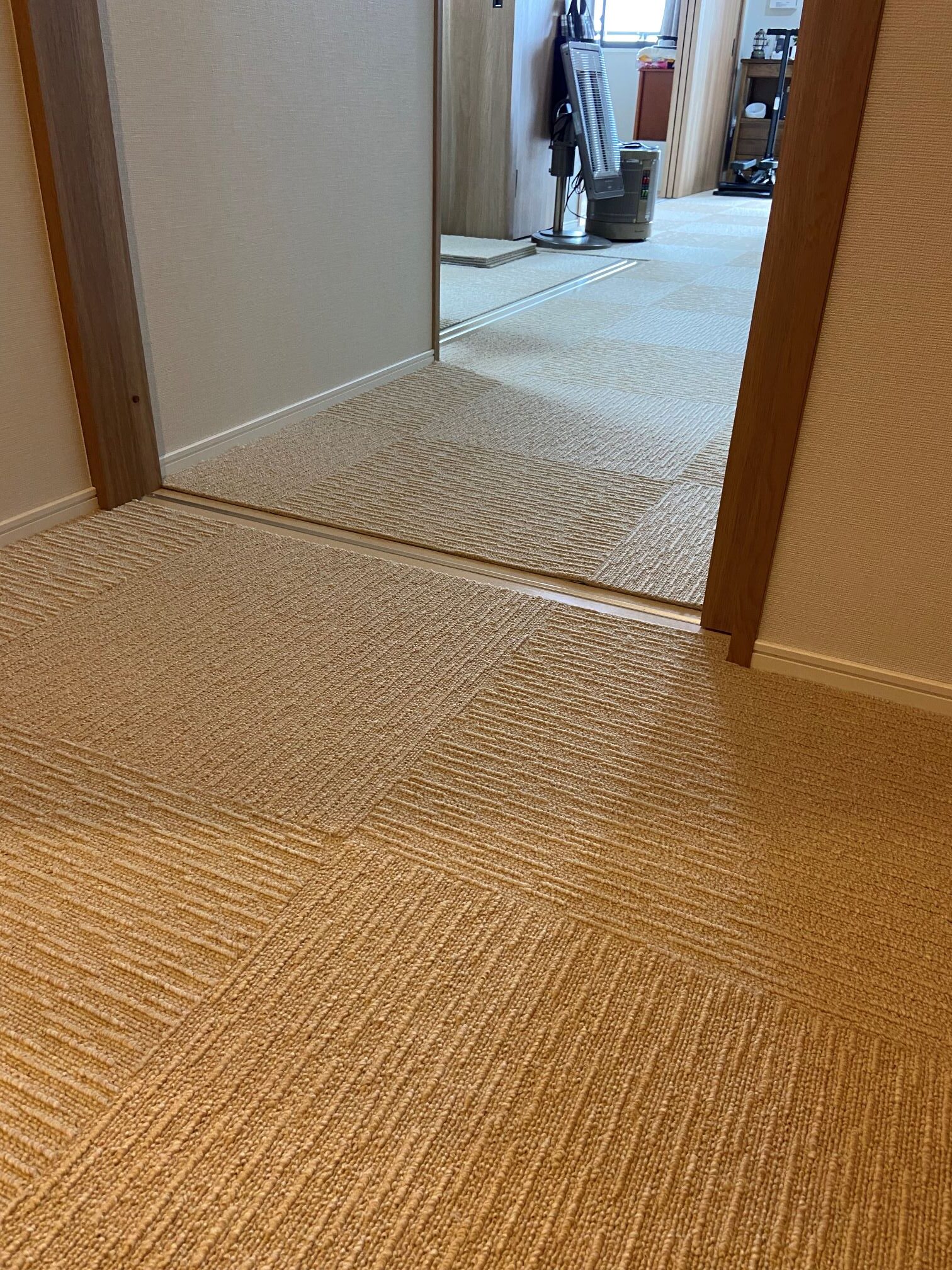 大阪府吹田市 F様邸 タイルカーペット施工例 フローリングの床に接着剤いらずのタイルカーペットを家具を移動しながら施工させていただきました♪ ループに高低差のあるナチュラルな雰囲気のカーペットにて。 東リ㈱ FF2103 約43㎡ 施工時間約2時間