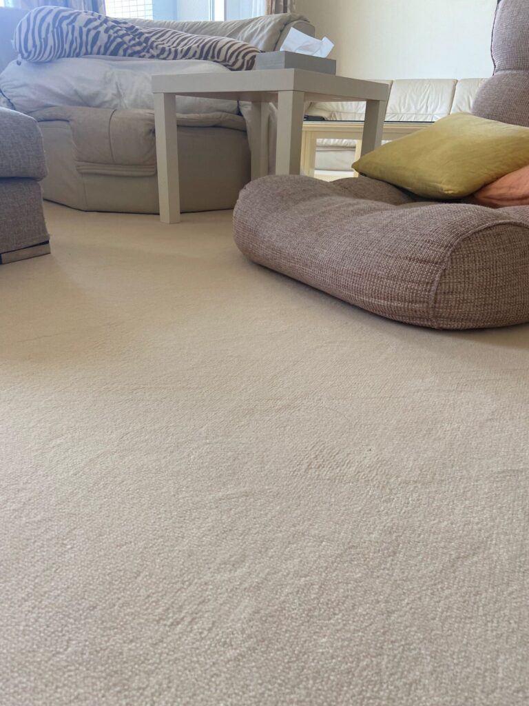 カットパイルの遊び毛の出ないナイロン100%の掃除が楽で肌触りの良いカーペットにて。