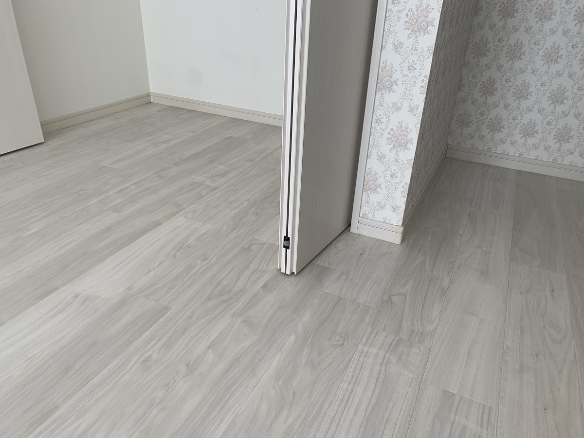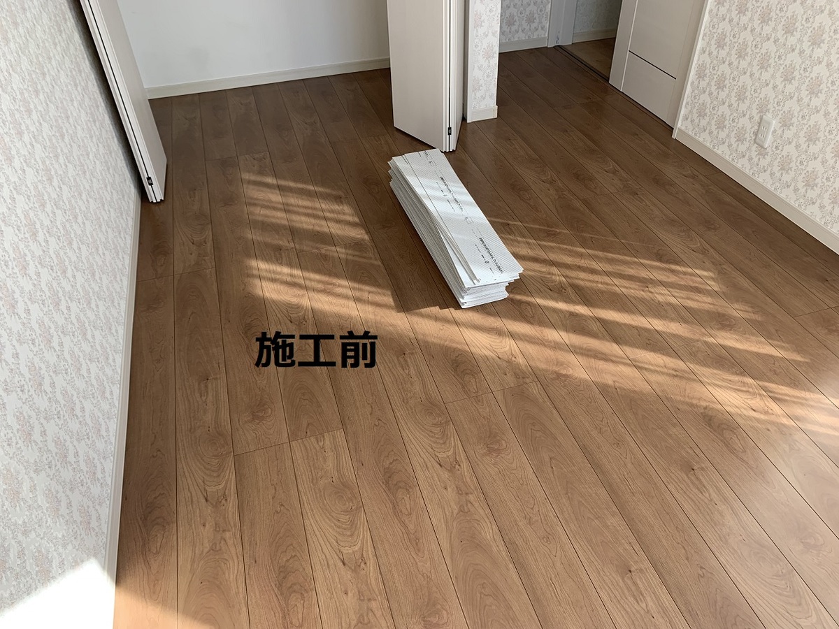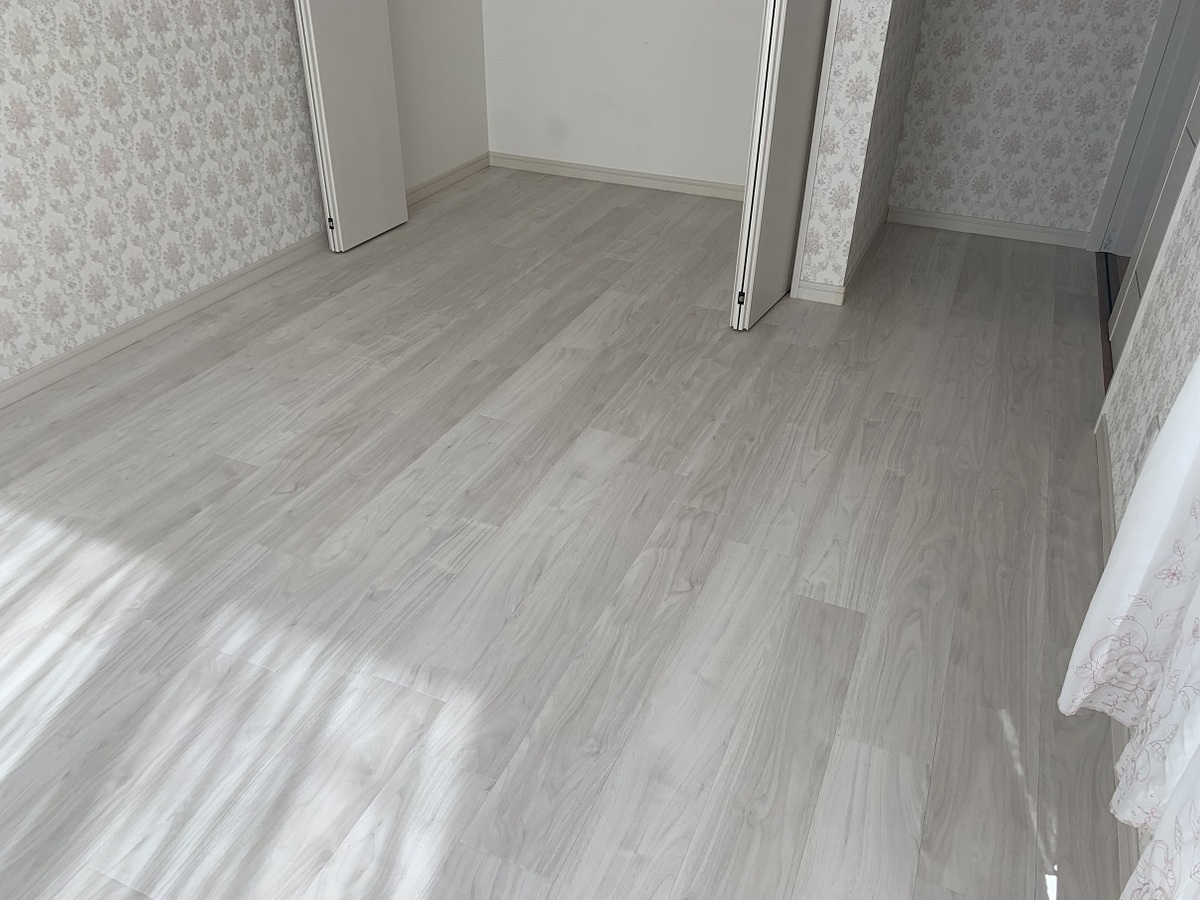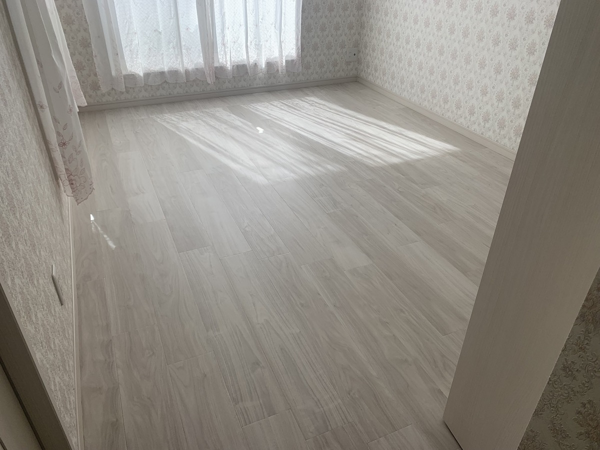 洋室のフローリングの床に接着剤いらずの裏面吸着タイプの塩ビタイルLAYフローリングピタフィーを施工させていただきました♪