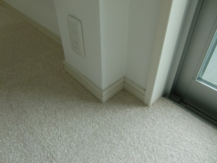 シリーズの中でも一番肌触りのいいカットパイルの綿毛のような肌触りのタイルカーペットにて。