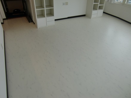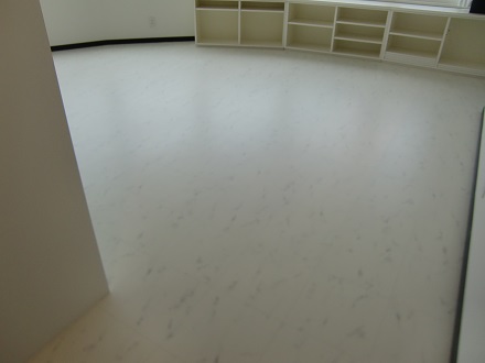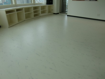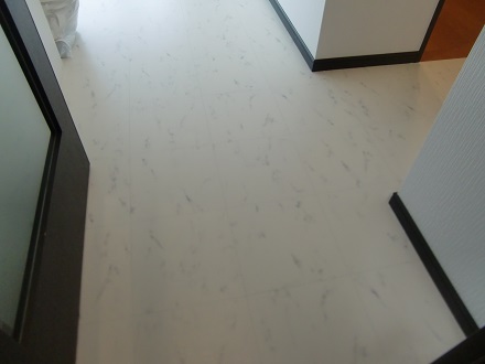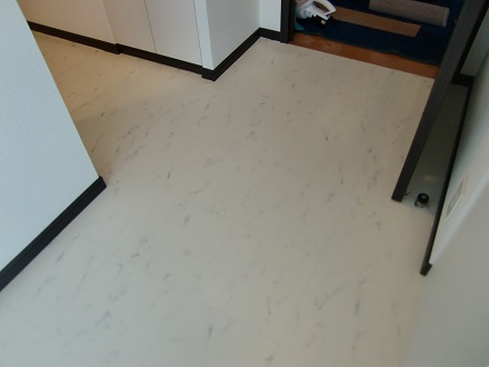 フローリングの色を変えたく、ワンちゃん向きの商材をということでこちらの白の大理石調のシートを選んでいただきました。