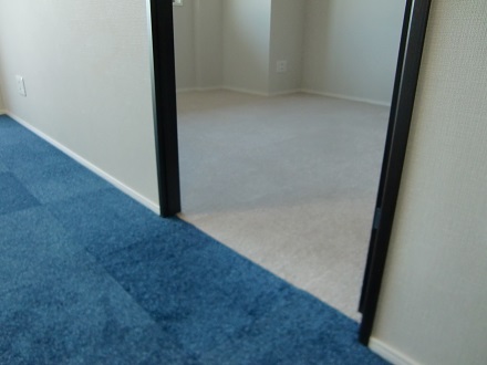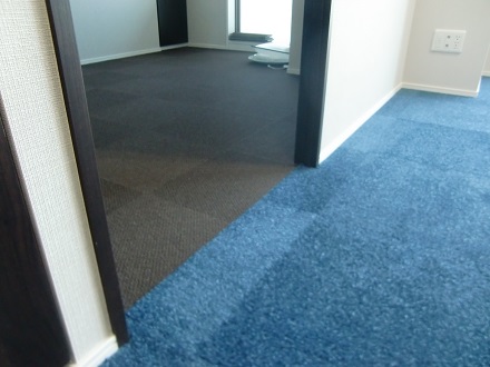事務所使用の洋室には建具の色に合わせた濃い茶系のループタイプの掃除の簡単なタイルにて。